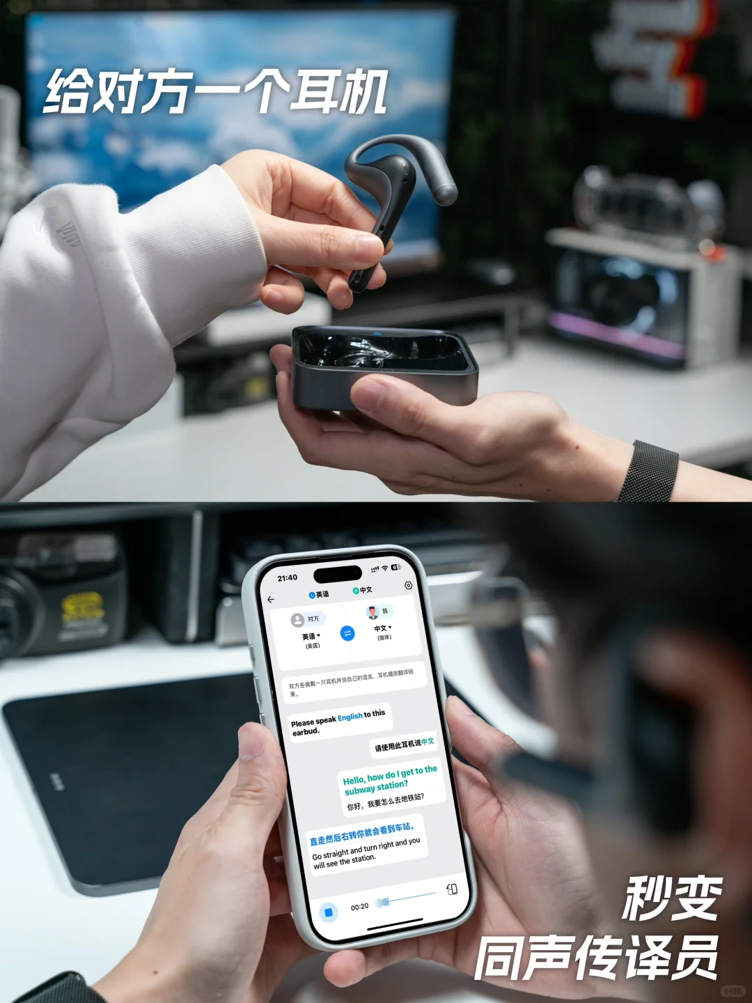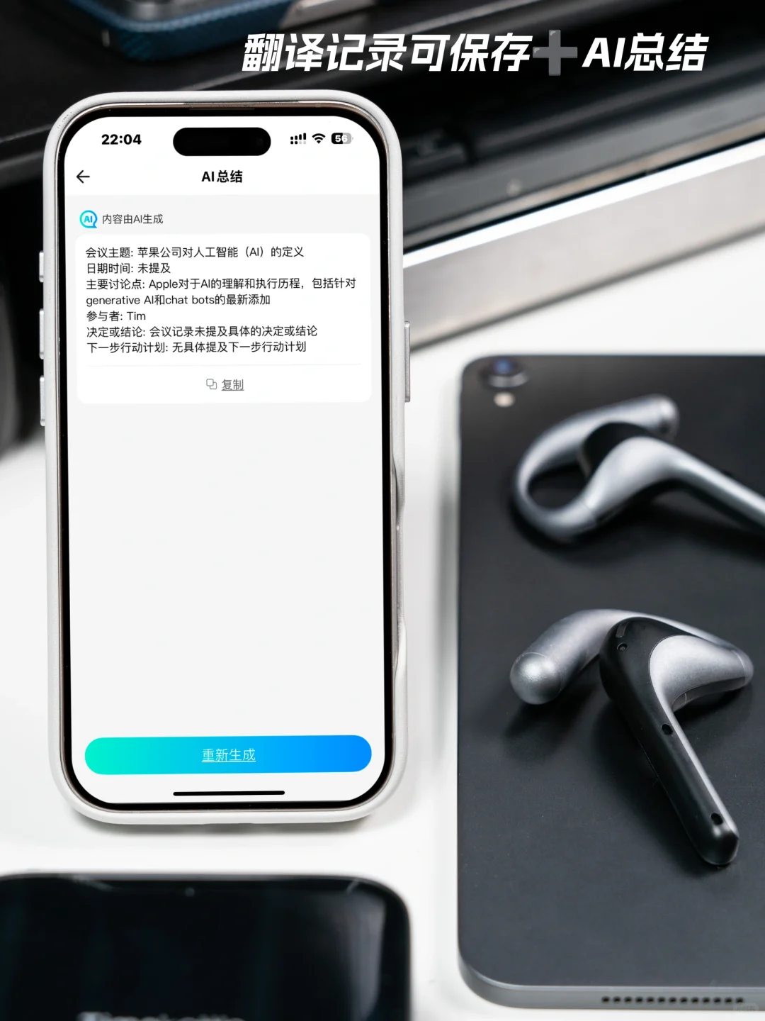 如果是会议模式,我还可以用手机收音,它能收听所有人的发言,并且实时在耳机里播放译文;轮到我说话的时候,可以一键切换发言模式,翻译后从手机播放,所有人都能听到。会议结束后,它还能用AI自动生成纪要并保存下来,确保不会错过任何细节。