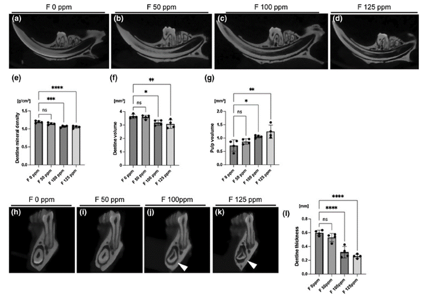 近日,美国诺瓦东南大学MaikoSuzuki研究团队在IntEndodJ发表了题为Ultrastructuralevaluationofadverseeffectsondentineformationfromsystemicfluorideapplicationinanexperimentalmousemodel的研究论文,发现系统性过量氟化物暴露(50-125ppm)会导致小鼠下颌切牙出现釉质发育不全、牙本质结构和性质改变(矿密度和体积降低、牙髓体积增加等)以及牙髓炎症等一系列不良影响,表明高剂量氟化物可致牙本质发育异常。