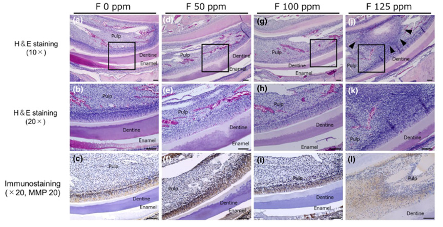 组织学评估进一步证实了氟化物对牙本质-牙髓复合体的危害。氟化物处理组的牙本质基质宽度增加,在高剂量氟化物作用下,牙髓组织出现微脓肿形成和炎症细胞浸润,成牙本质细胞数量减少,这一系列变化表明牙髓健康受到严重威胁,可能引发牙齿疼痛、敏感等问题,甚至影响牙齿的寿命。