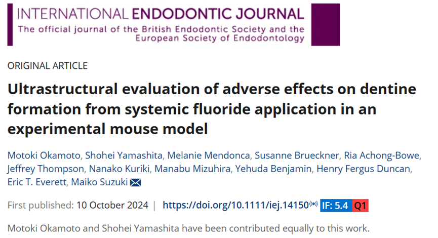 OkamotoM,YamashitaS,MendoncaM,etal.Ultrastructuralevaluationofadverseeffectsondentineformationfromsystemicfluorideapplicationinanexperimentalmousemodel.IntEndodJ.PublishedonlineOctober10,2024.doi:10.1111/iej.14150