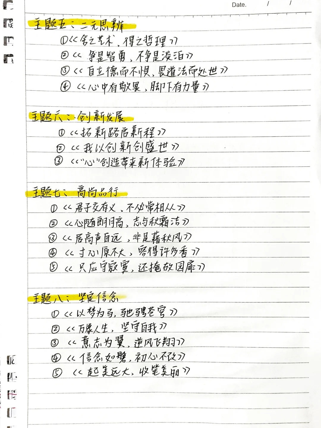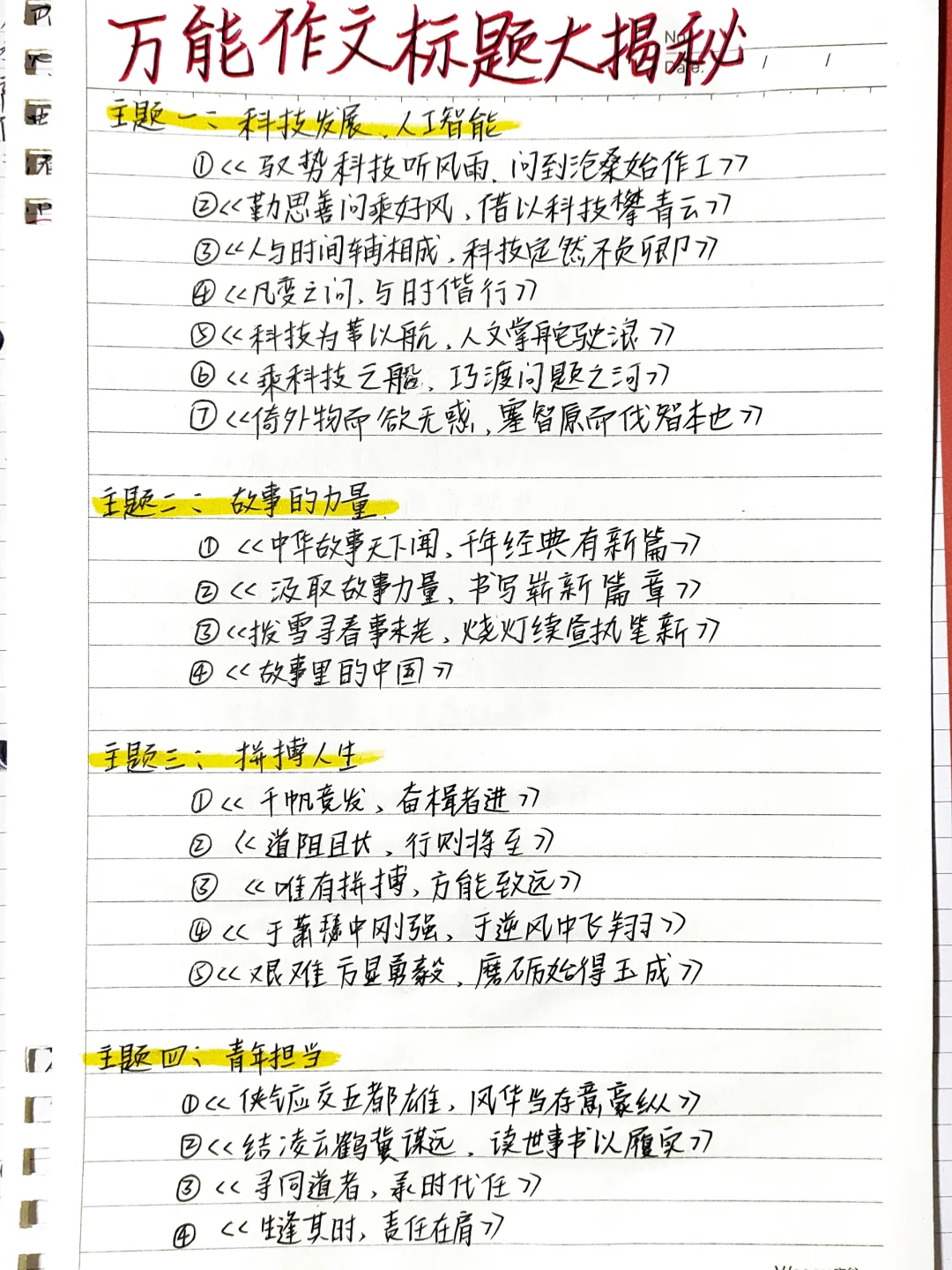 🎈按主题整理了一期作文标题 ⛰主题一∶科技发展、人工智能 ⛰主题二:故事的力量 ⛰主题三:拼搏人生 ⛰主题四:青年担当 ⛰主题五:二元思辨 ⛰主题六:创新发展 ⛰主题七:高尚品行 ⛰主题八:坚定信念 💭素材整理于网络