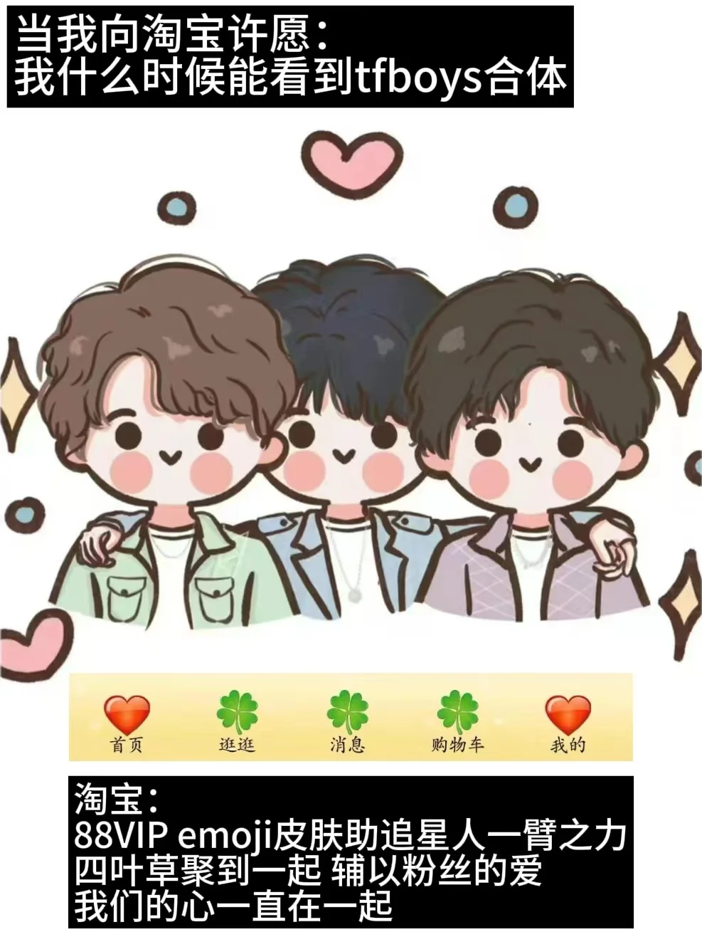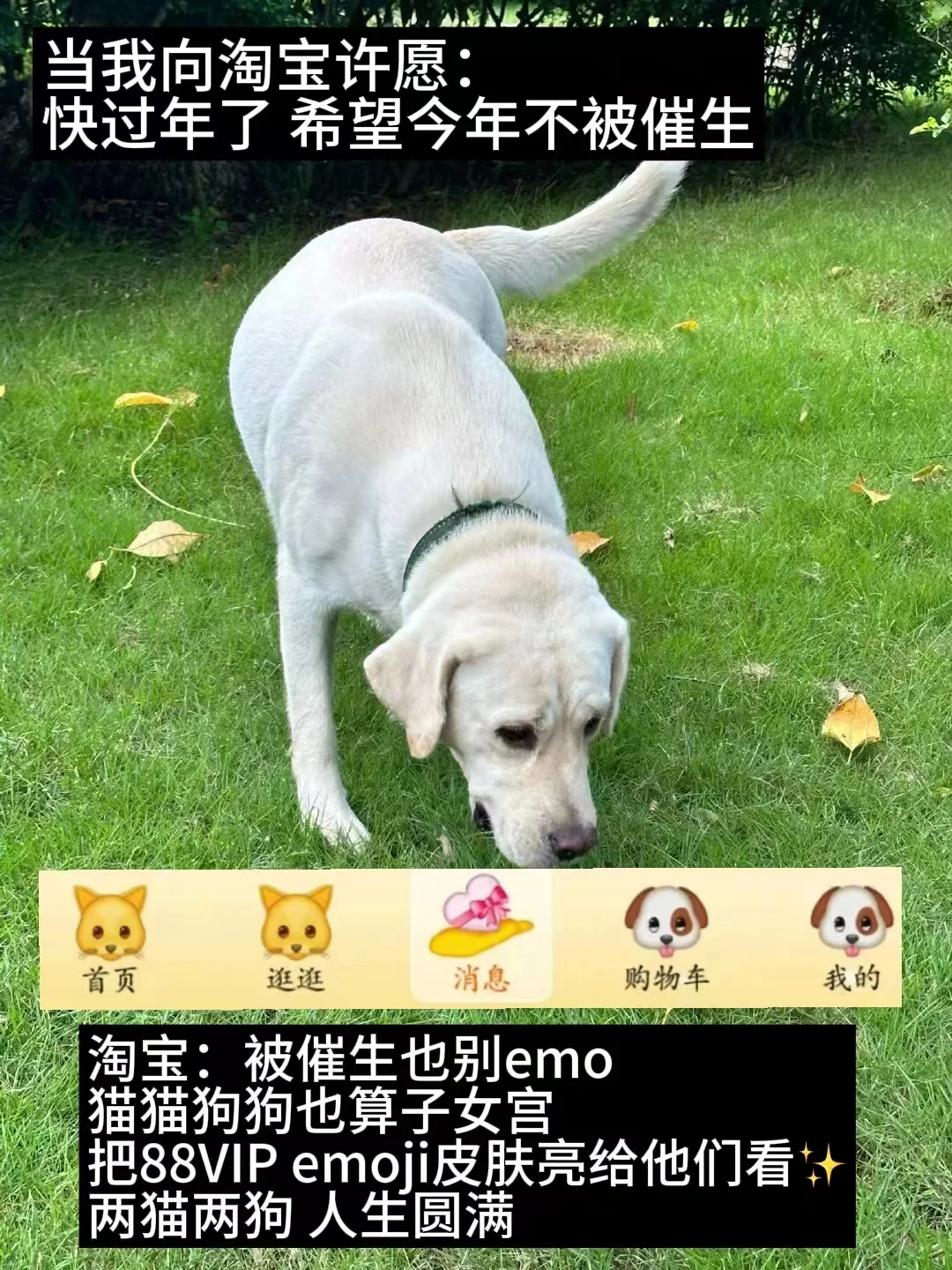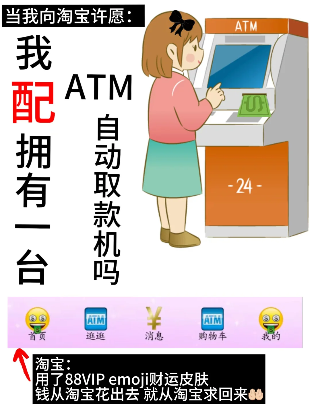 众所周知 雍和宫许愿[仙女R] 主打一个已读乱回 之前有人许愿要高升 结果家里从7楼搬到了15楼 嗯...怎么不算高升呢[猪头R] —— 而我大学的时候 许愿财源广进 结果裁 员 广 进了 我是那个被裁的员工[可怜R] 一个叫刘x广的男同学 接替了我食堂15r/h的兼职 难为雍和宫找到一个叫x广的同学了 嗯...怎么不算灵验呢[汗颜R] —— 跟朋友说起这个事的时候 我 :以后不敢雍和宫许愿了 但是我真的习惯emo的时候 遇事不决先整点玄学 比如壁纸换上财神爷 给自己整点心理暗示 朋友:那你不如试试淘宝捏皮肤 新上的88VIP X emoji联名[耶R] 名不虚传的赛博雍和宫 还无副作用 适合你这种经常emo的人 —— 正好我是88VIP 于是我去试了 试完我真的不emo了! 因为它真的太抽象了! 笑得我眼泪都出来了 还我妈生眼泪💧 —— 我说 想看到陶喆 它给我拽出来一个偏分emoji 我说 想见到tfboys合体 它给我整上三个四叶草🍀排排站 我说 我配拥有一个ATM机🏧吗 结果你 ATM和吐钱的emoji也有? 我说 我想要个理想爱人[红色心形R] 我寻思你这回满足不了我吧 结果你 微微一笑: 这边给您推荐财神爷 为理想爱人 好的 这次我真的拒绝不了你...[赞R] —— 连万千中国人头疼的催生问题 你说 也可以用emoji皮肤解决 换上猫猫狗狗emoji皮肤 遇到亲戚甩给他们看 猫猫狗狗怎么不算子女宫呢 —— 这个皮肤 还是太全面了 怎么可以这么有梗! 我在评论区也安排一个梗 大家猜猜看![得意R]