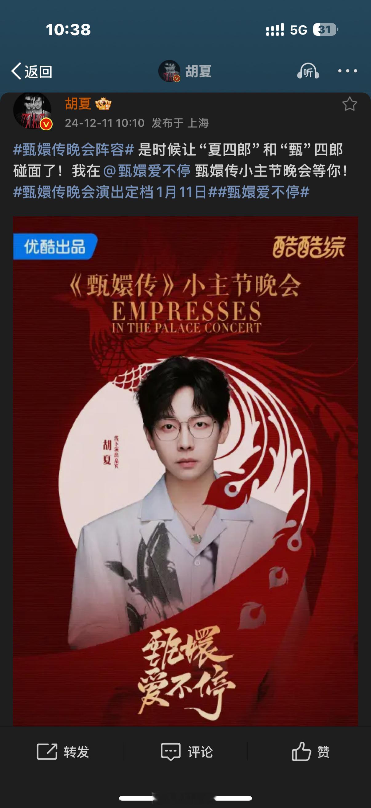 胡夏 夏四郎要去和甄四郎碰面了 胡夏加盟甄嬛传小主节,引发了怀旧热潮。夏四郎与甄四郎的同框期待,加上胡夏的经典嗓音,使小主节充满了吸引力。他在舞台上的每一个音符,都将与甄嬛传的故事相互交融,成为观众心中难忘的回忆,期待值拉满。