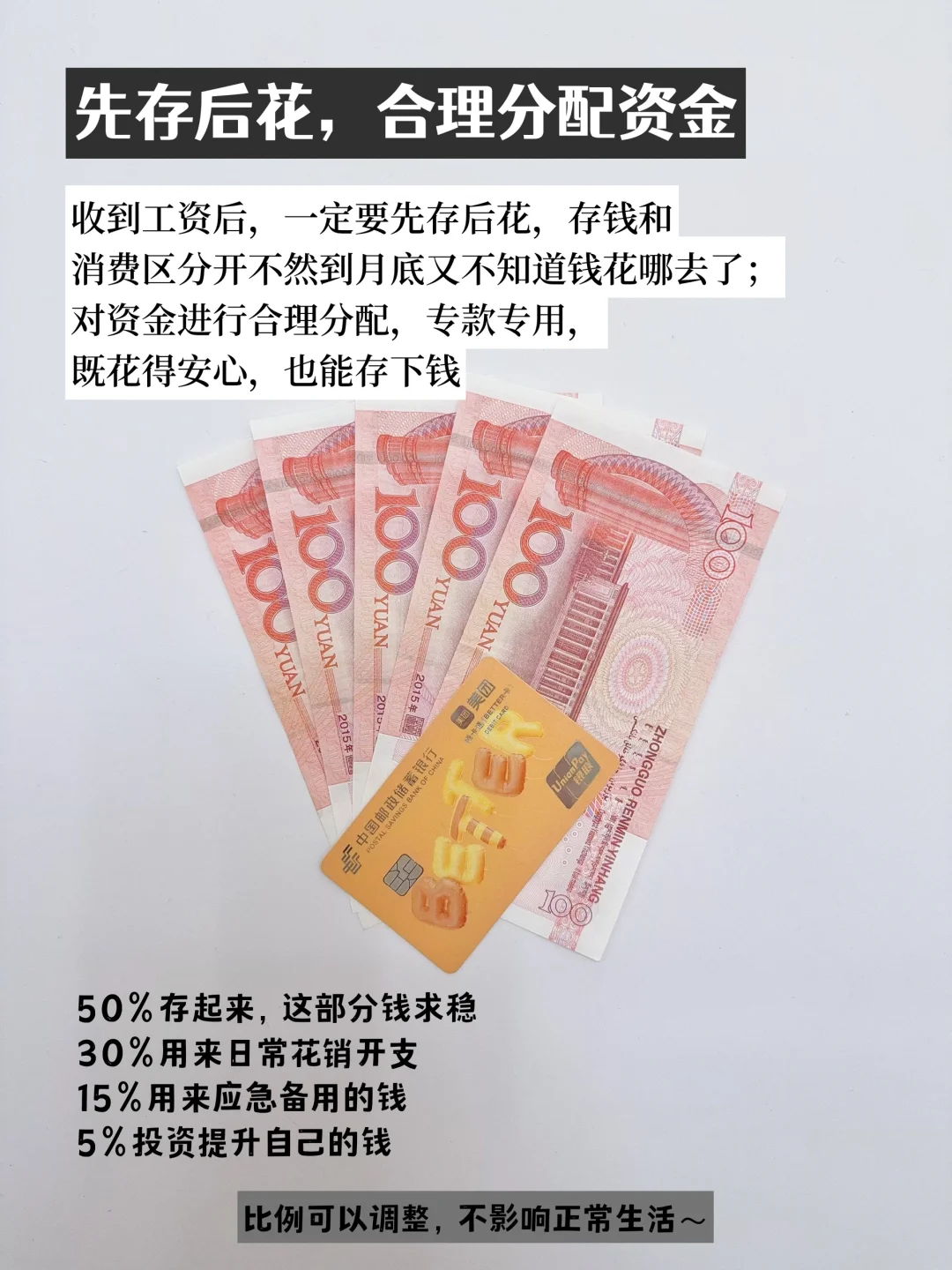 收到工资后,一定要先存后花,存钱和消费区分开,不然到月底又不知道钱花哪去了;对资金进行合理分配,专款专用,既花得安心,也能存下钱。