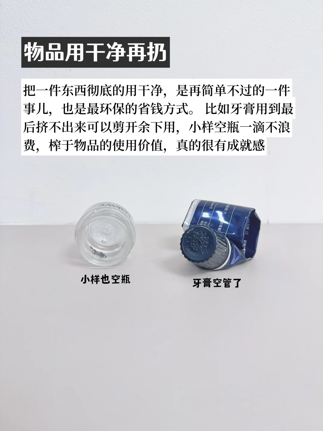 把一件东西彻底的用干净,是再简单不过的一件事儿,也是最环保的省钱方式。 比如牙膏用到最后挤不出来可以剪开余下用,小样空瓶一滴不浪费,榨于物品的使用价值,真的很有成就感。