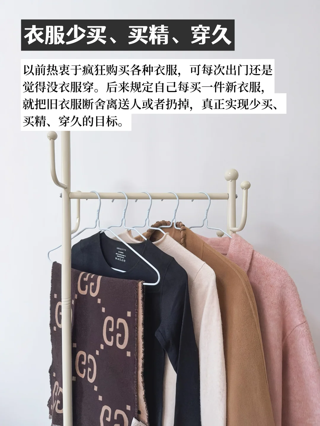 以前热衷于疯狂购买各种衣服,可每次出门还是觉得没衣服穿。后来规定自己每买一件新衣服,就把旧衣服断舍离送人或者扔掉,真正实现少买、买精、穿久的目标。