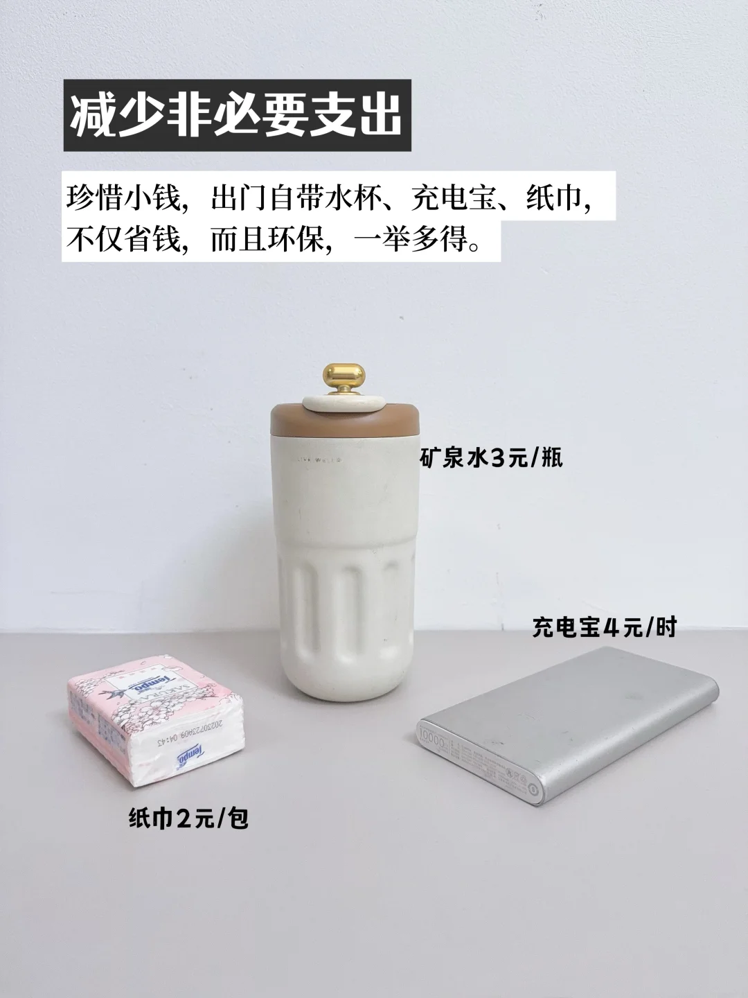 珍惜小钱,出门自带水杯、充电宝、纸巾,不仅省钱,而且环保,一举多得。