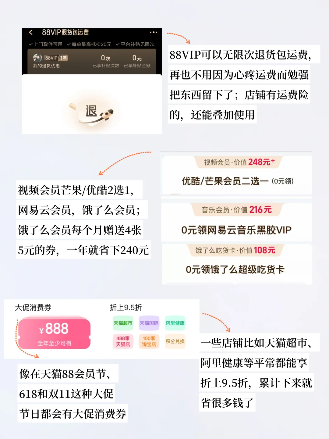 它的权益非常多而且十分实用,比如视频会员优酷芒果二选一,饿了么会员,网易云会员,其中饿了么会员一年就可以省240元。