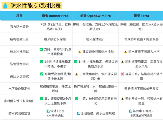 综合来看,Runner Pro5的防水能力不仅能应对日常游泳,还具备抗热水、强冲击等极端环境的能力,是目前市面上真正意义上可“长时间深水使用”的高阶产品。
