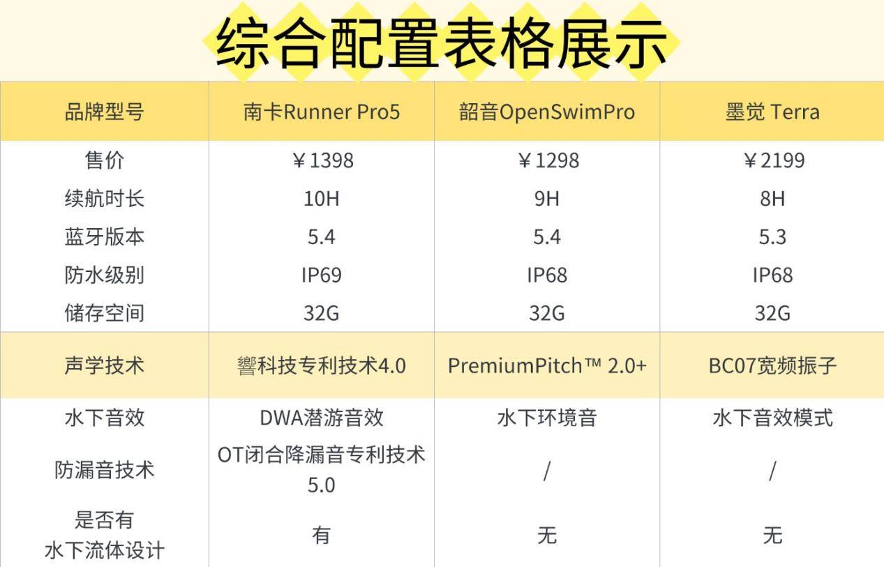 为了更清楚地展示几款游泳耳机在核心性能上的区别,我们整理了一张参数对照表,涵盖防水等级、内存容量、连接方式等关键信息,方便大家在后续评测中更好地了解每款耳机的具体表现和适用场景。