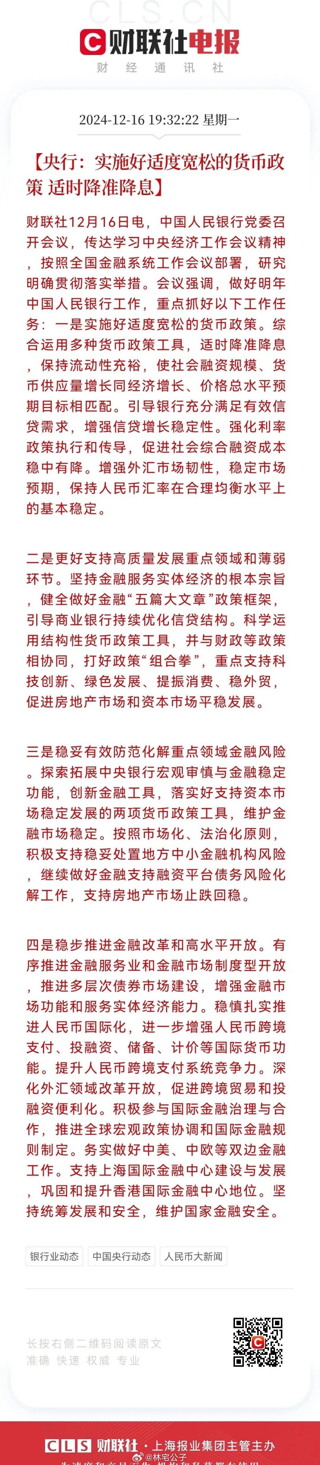 晚间央行再次重申了两点,第一点是要加强落实稳定楼市和股市,第二点是再次强调明年的货币政策将会更加宽松,降准降息预计很快就要到了