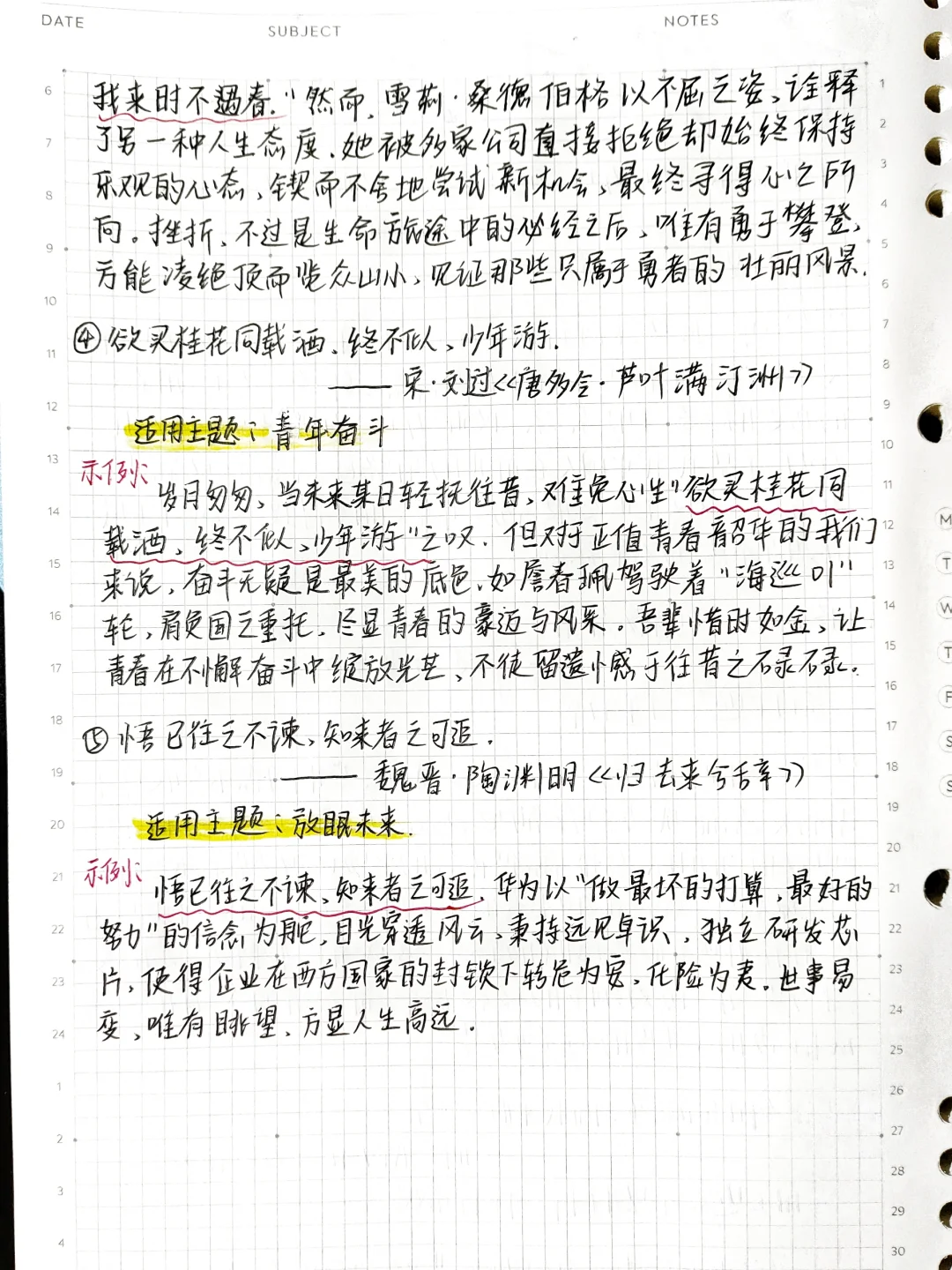 hi~今天和大家分享的是一期句子素材 在我们写作文的时候,运用一些古诗词啊,名人名言上去,通常会给我们的作文很加分呢,让我想起了前两天考六级写作文,题目就要求我们要使用一些名人名言来佐证我们滴作文,所以我们平时可以多积累一些名人名言,看到喜欢的句子我们也可以摘抄下来! 在我之前高中的时候,我们的语文老师就一直要求我们每个礼拜都要适当的摘抄一些优美的句子素材呢,通过这种方式积累下来不仅可以丰富我们的作文素材库,还可以提升我们的文学素养! 🍒千般荒凉,以此为梦;万里蹀躞,以此为归。 ——《文化苦旅》 🌷尽小者大,慎微者著。——《资治通鉴》 🍒欲买桂花同载酒,终不似,少年游。——宋·刘过 《唐多令·芦叶满汀洲》 🌷悟已往之不谏,知来者之可追。——魏晋·陶渊明 《归去来兮辞》 ⛰素材来源:纸条