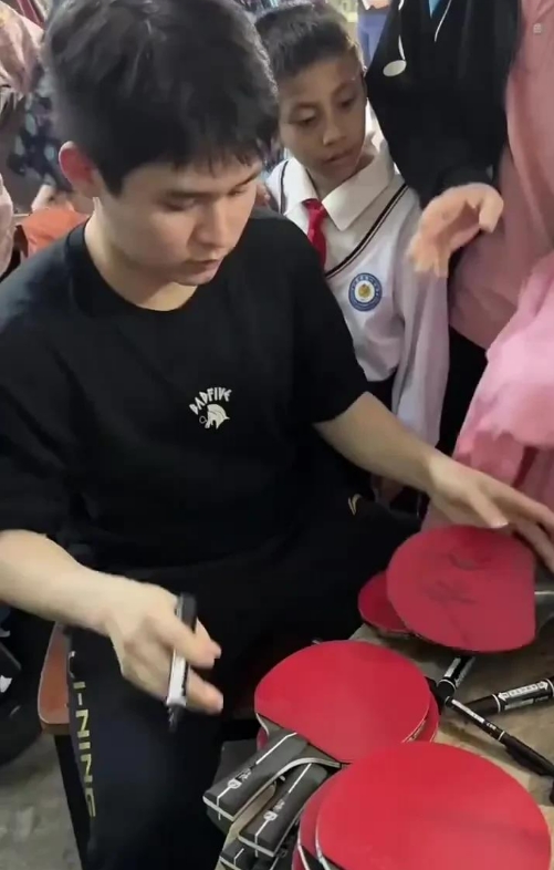 林诗栋回老家海南啦!一回来就到妈妈的饭店里帮忙干活,忙前忙后的。这小伙儿还和村里的人切磋乒乓球技呢,那场面可热闹了。他球技高超,大家都佩服得很。这不,打完球后邻居们都排着队找他要签名,把他围得水泄不通。林诗栋一点架子都没有,耐心地给大家签名,真是咱海南的骄傲,人气超旺!