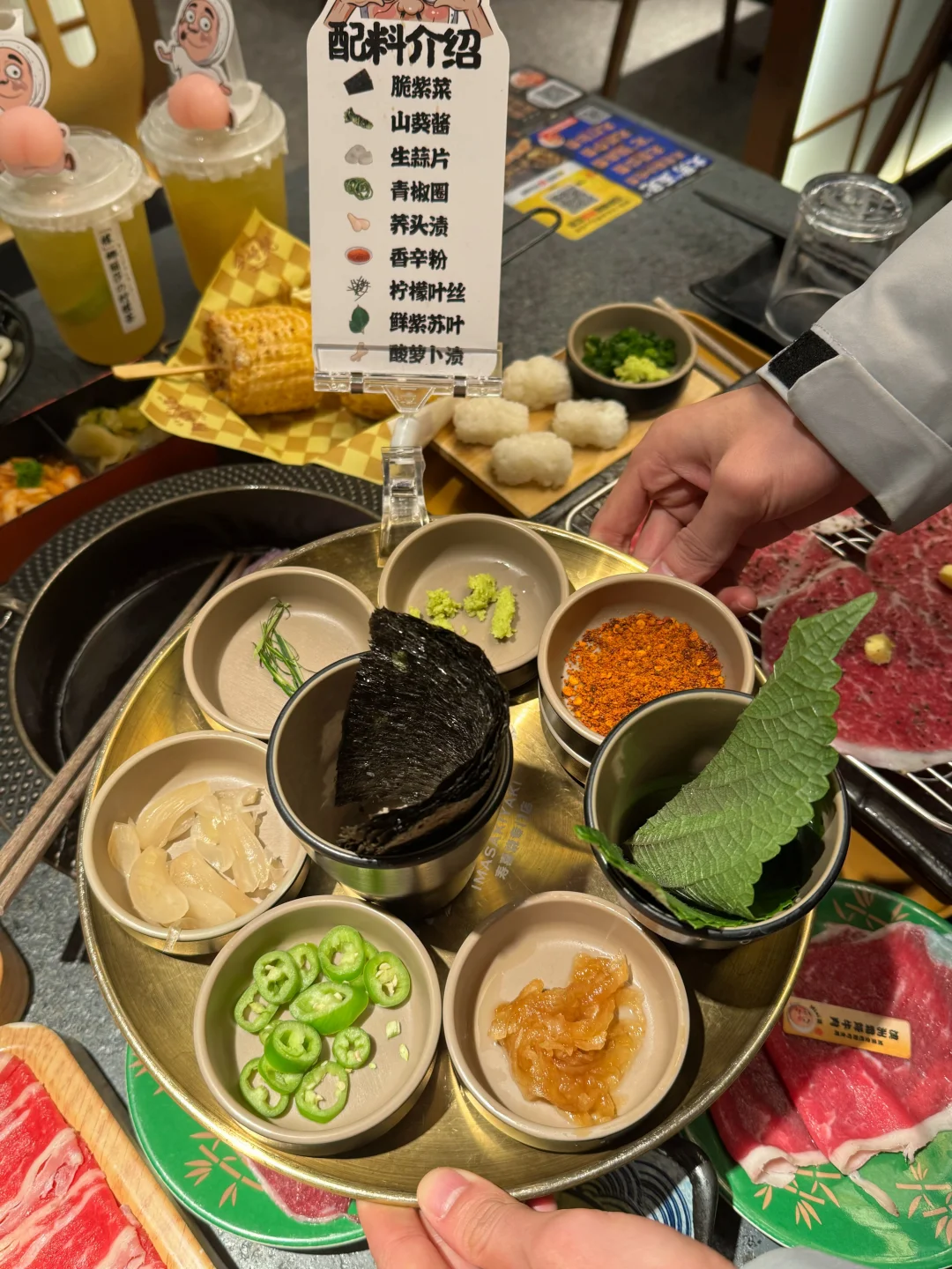 配料chao丰富!!紫菜、紫苏叶、无菌蛋、山葵、蒜片、青椒圈、柠檬叶、酸萝卜等十几款小料