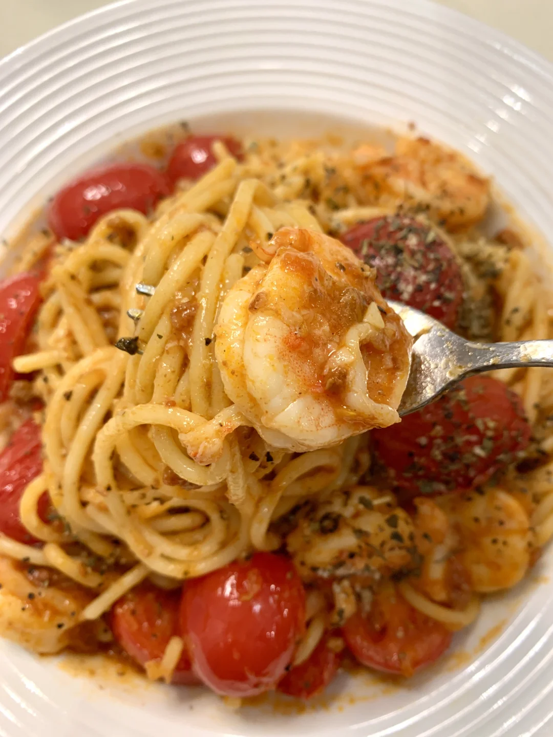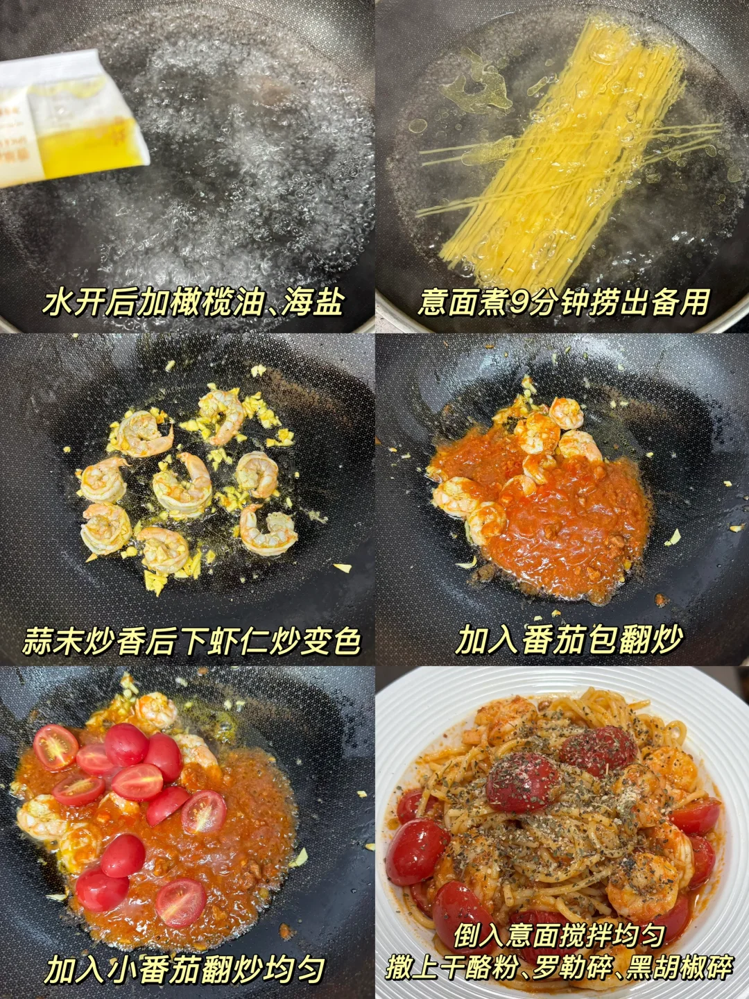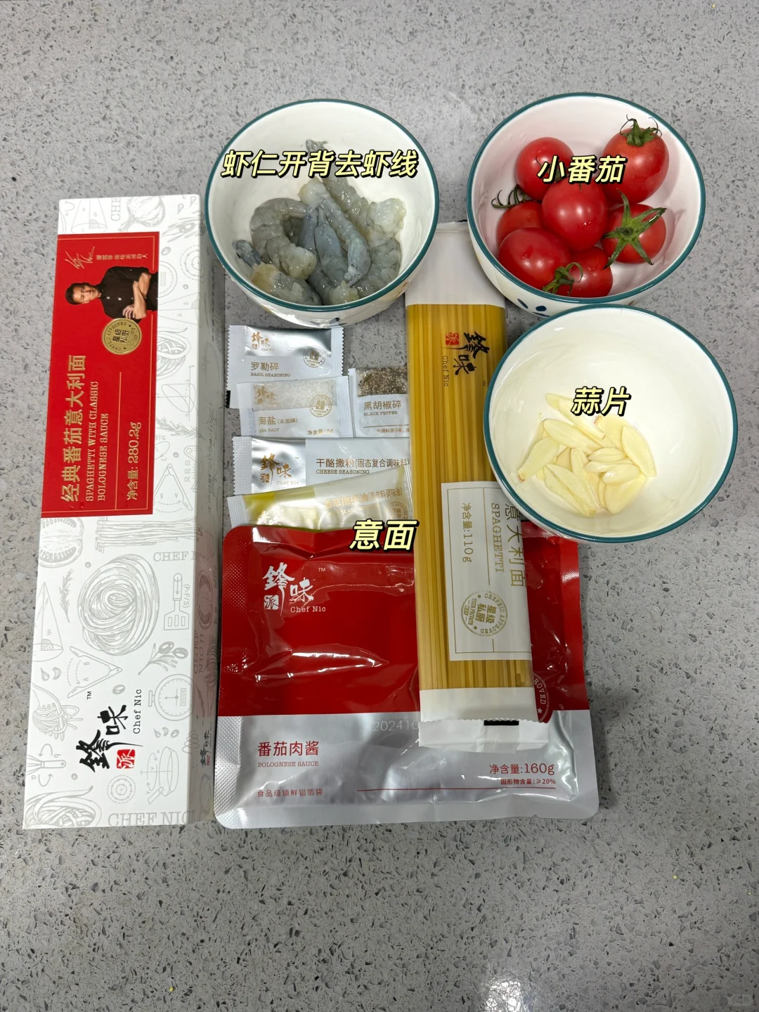 锋味派番茄肉酱意面、虾仁、小番茄、蒜末