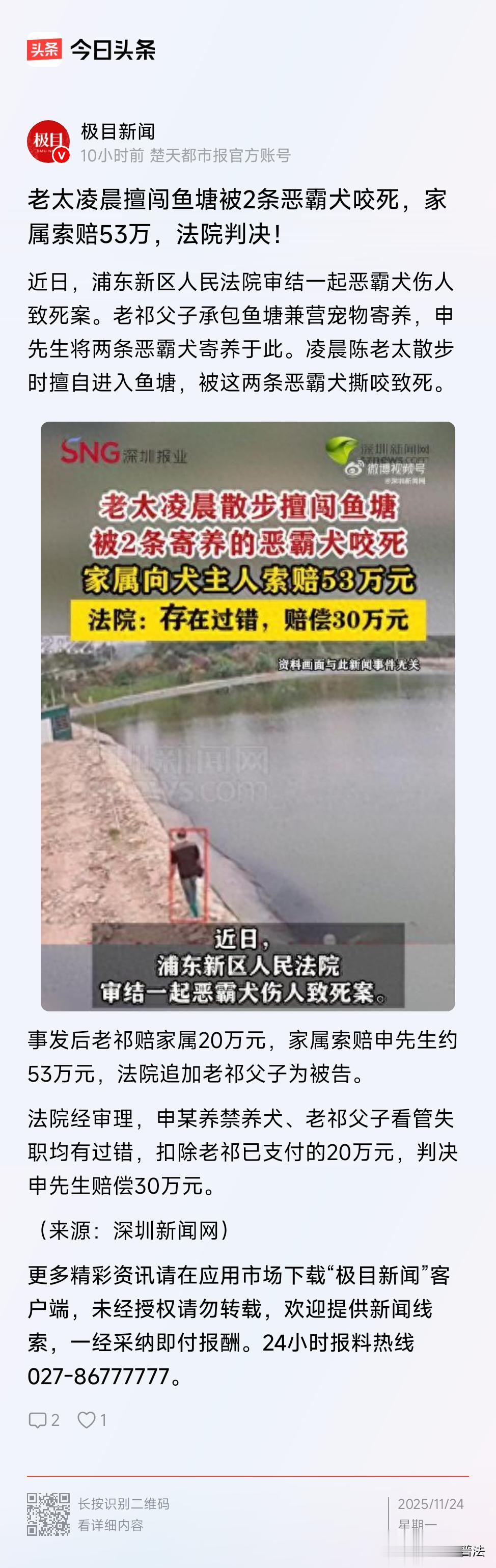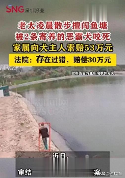 上海浦东,男子在当地承包鱼塘,兼营宠物寄养,一老太凌晨擅闯鱼塘被2条恶霸犬咬死,家属索赔53万,法院判决,除前期已支付20万,还需要赔偿30万!