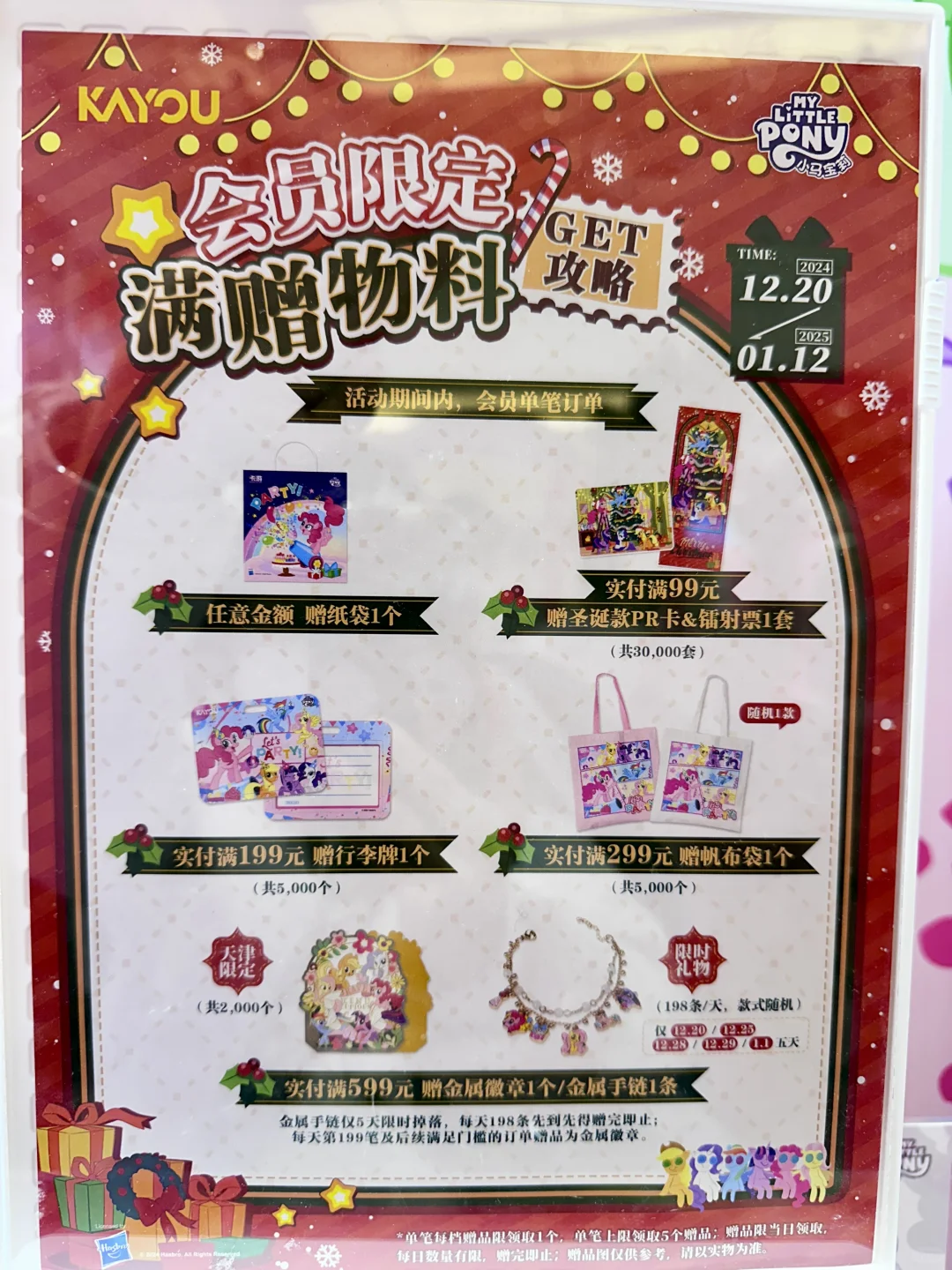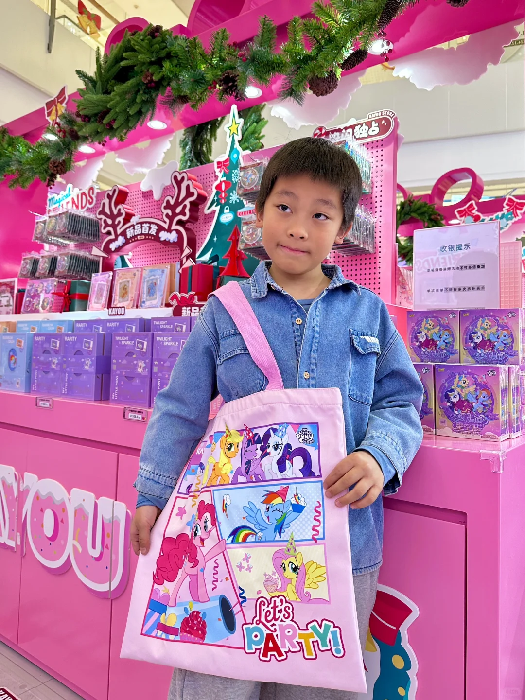 接小孩哥放学后,我们去合生汇逛了哈,在门口就发现了小马的圣诞派对海报,那不得赶紧冲~ ~ 原来小男不仅追光,也爱小马宝莉噢,因为,小马宝莉圣诞快闪,不只是有粉色可可爱爱的小东东,高能新品多多~ ~ 人气G4信使云游系列,立牌,徽章,友谊绘影,约上粉迷们,现场拿下吧。 ~ 想和小马们一起过圣诞🎄,敢来就不会空手出来。对了,现在有蛮多满赠物料噢,我喜欢帆布包,实在是太萌,我得带走。