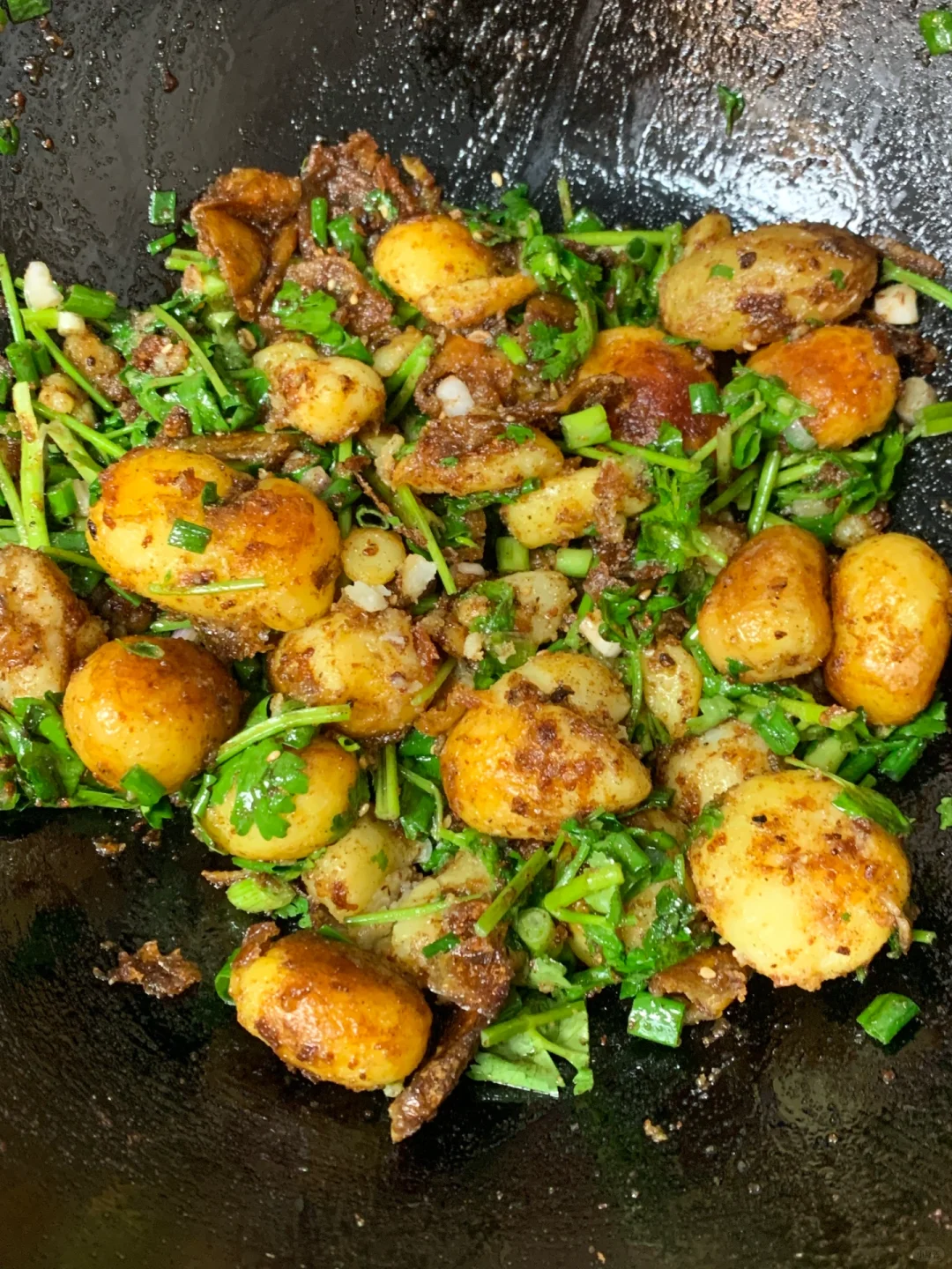2⃣️土豆放凉撕去皮,锅中多放一点油,倒入小土豆中小火煎至金黄,适当用锅铲压几下