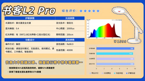 此外,作为有多年生物光学研发经验的医护级护眼台灯品牌,书客对待护眼效果非常严苛,致力于打造医学养护眼台灯。书客为了降低用眼疲劳、有害蓝光、并增强各种环境下的视觉舒适度,研发可调RRT2.0红光养眼技术,配合上针对视觉敏感期、学习成长期、视觉成熟期等不同年龄段的视力发展情况而设计出的最完美全链路“3型分段”红光养眼,配合专研的112颗SunLux护眼芯片,可延缓92%用眼疲劳,降低96%近视风险。为了实现更安全的护眼效果,采用自研第三代SDIT自适应调光技术,以120次每秒监测频率,实时捕捉环境光线,并转化成亮度、色温、柔和度等多维度数据,根据数据进行智能补偿,将照明光线始终维持在安全、不伤眼的适宜范畴。使得书客L2 Pro在光照均匀度、光照柔和度、近视风险等核心维度都是行业表现最优秀的产品!