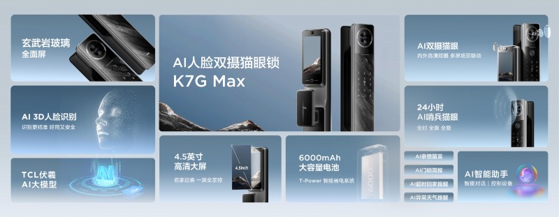作为全球智能锁行业首个深度融合AI技术的品牌。本次带来全新升级的TCL AI人脸双摄猫眼锁K7G Max完美融合伏羲AI大模型,同时正式接入第三方大模型DeepSeek、豆包、ChatGPT等,为TCL智能锁注入强大的AI能力。这款产品搭载了AI 3D结构光刷脸、AI双摄分布式猫眼、24小时AI哨兵猫眼等技术,大幅提升智能锁用户的使用体验。