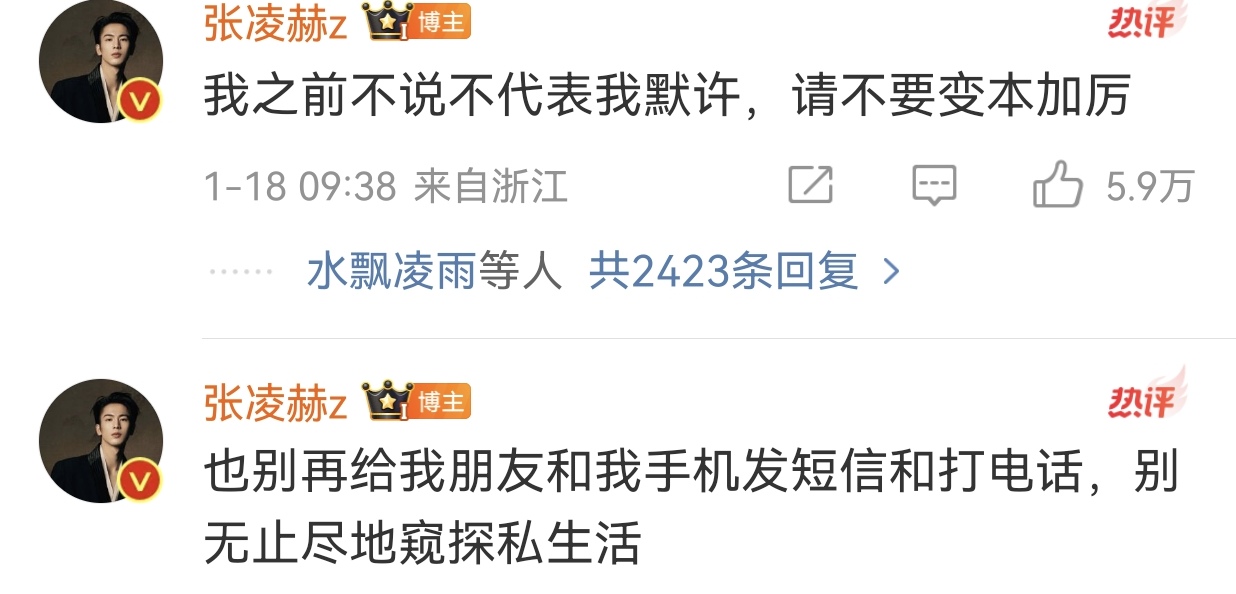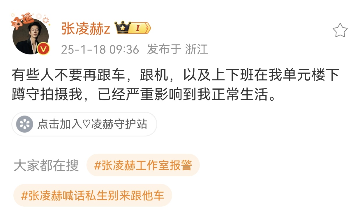发火的风吹到了张凌赫,微博怒斥发文告诫私生饭别给脸不要脸,严重拍摄跟拍到个人居住场所,严重影响生活,公司已进行报警处理寻求帮助,对此你怎么看?