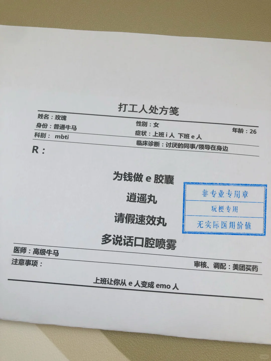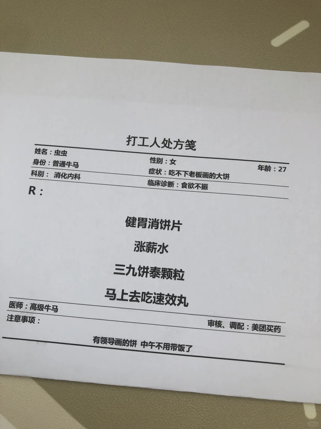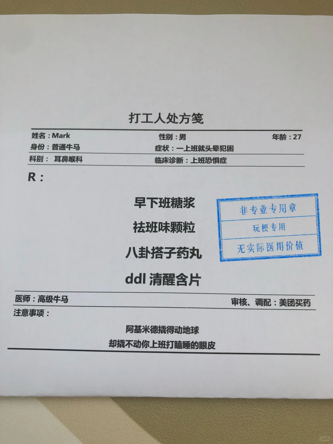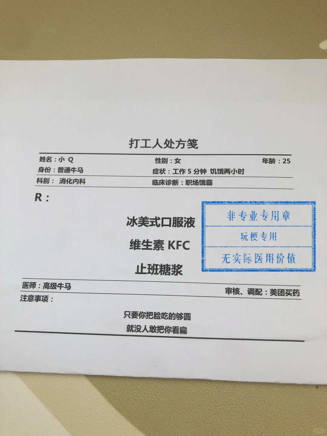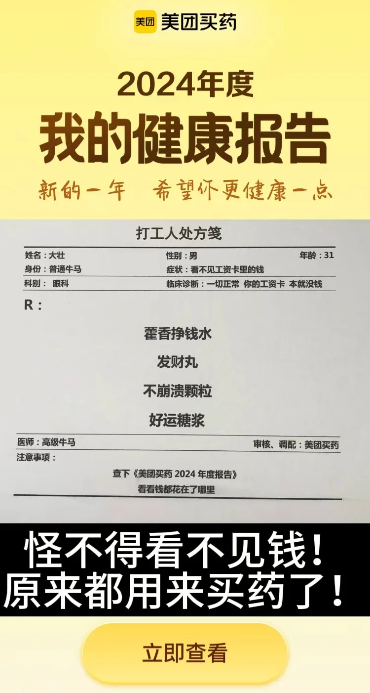 同事A说: 新来的同事B是神医👨‍⚕️ 开的药方稳准狠 药到病除 他们服用了一天感觉神清气爽! —— 我:胡扯!公司哪来的医生! 怎么可以乱吃药![汗颜R] —— 同事A:少侠莫慌!这是你的药方! 我低头一看 小Q症状:工作5分钟 饥饿两小时 临床诊断:职场饿霸[黄金薯R] 药方: 冰美式口服液 维生素KFC🍔 止班糖浆 原来...这是真神医! —— 我:你很有创意啊! 同事B:久病成医呗 都能自己开药方了 昨天美团买药【年度健康报告】上线 我才发现今年又扣扣嗖嗖的 在买药方面花了很多钱 我简直是当代打工人的代表 一边说想辞职 一边含泪满勤 一边说想🐭 一边下单速效救心丸 一边说嗓子疼没什么大不了 正好扮演安陵容:宝娟 我的嗓子~ 背地里却悄悄 给自己买上金嗓子、开喉剑、西瓜霜 不过我好像上月又忘请假了... 我的全勤奖![钱袋R] 我:要不你拿着美团买药的年度报告日历去 用它当你的请假条 同事B:神医啊!Q大夫!