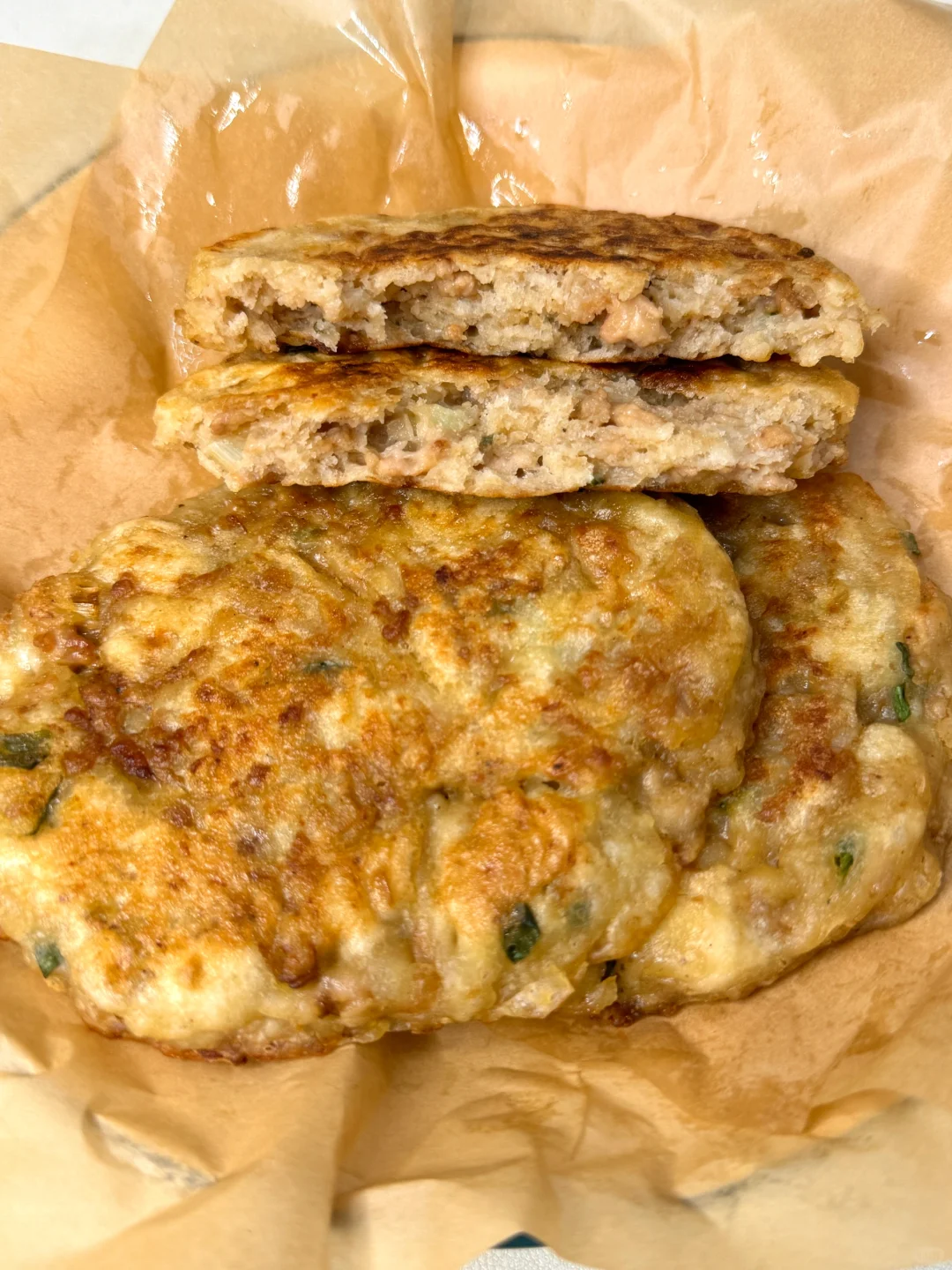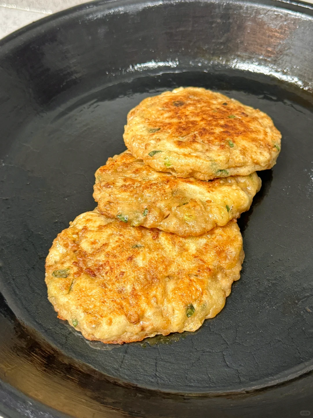 3️⃣调好的肉馅加入面糊中搅拌均匀,锅中刷油摊入面糊,小火煎至两面金黄,按压轻松回弹即可