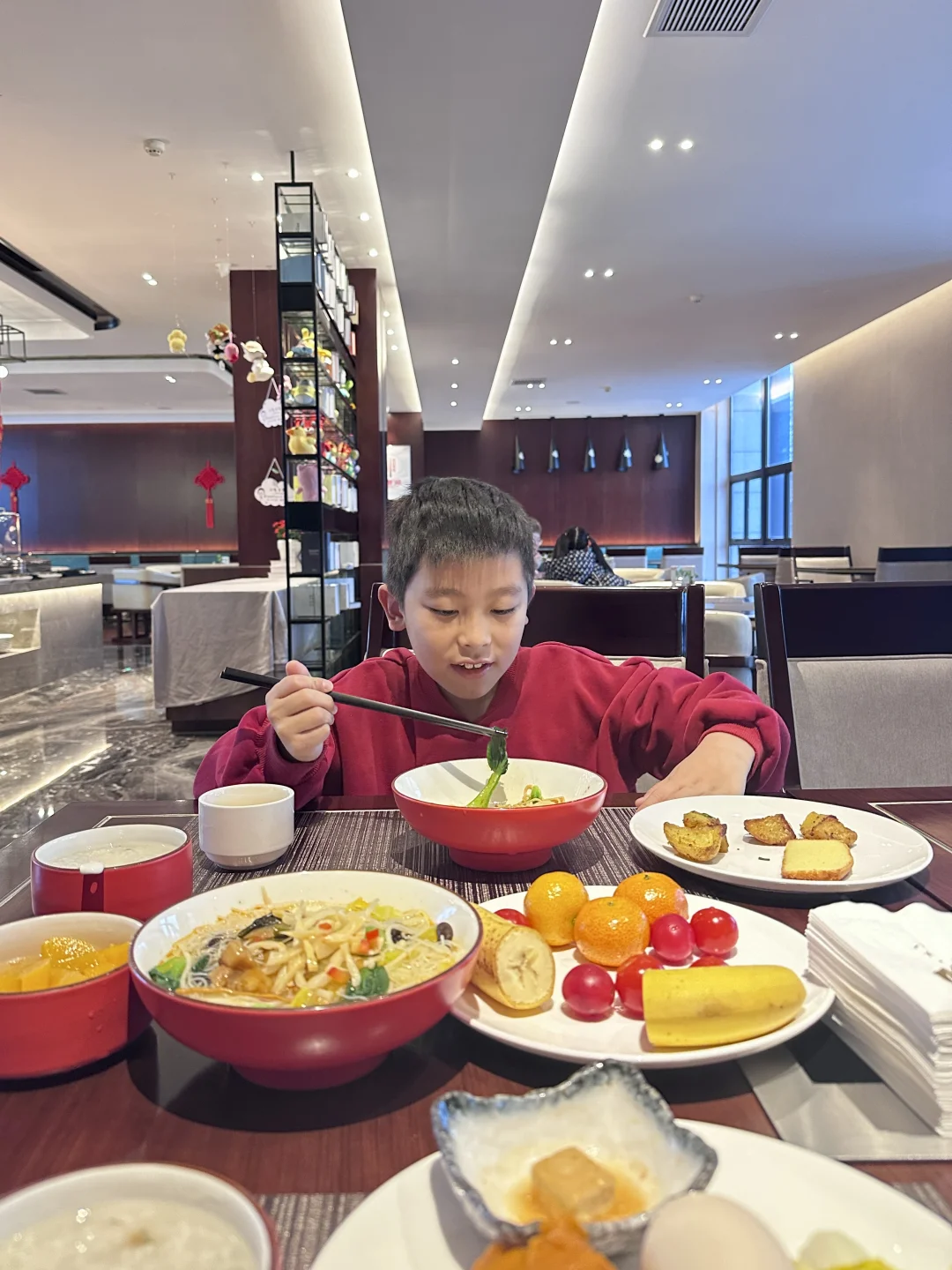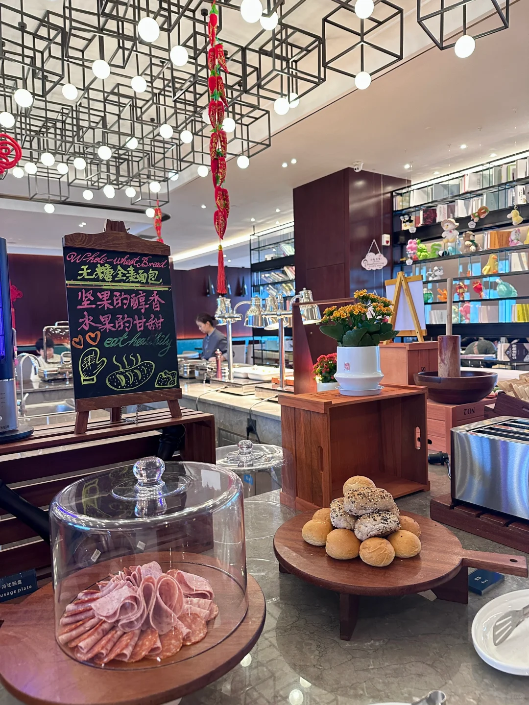 早餐中规中矩,品种还算丰富,用餐环境也舒服,酒店设施很新,下次出行可以冲!