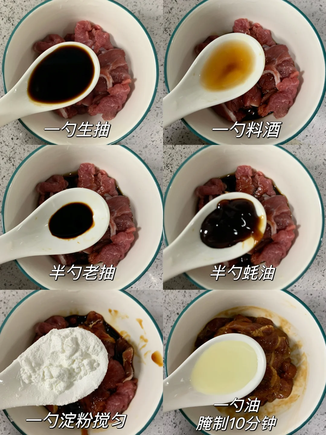 1️⃣牛肉切片,加1勺生抽、1勺料酒、半勺老抽、半勺蚝油、1勺淀粉搅拌均匀,再加入1勺油腌制10分钟