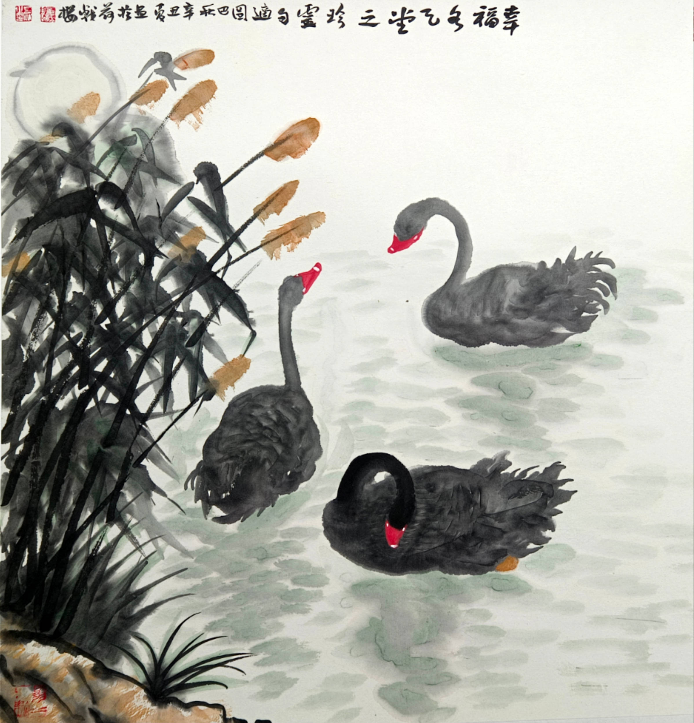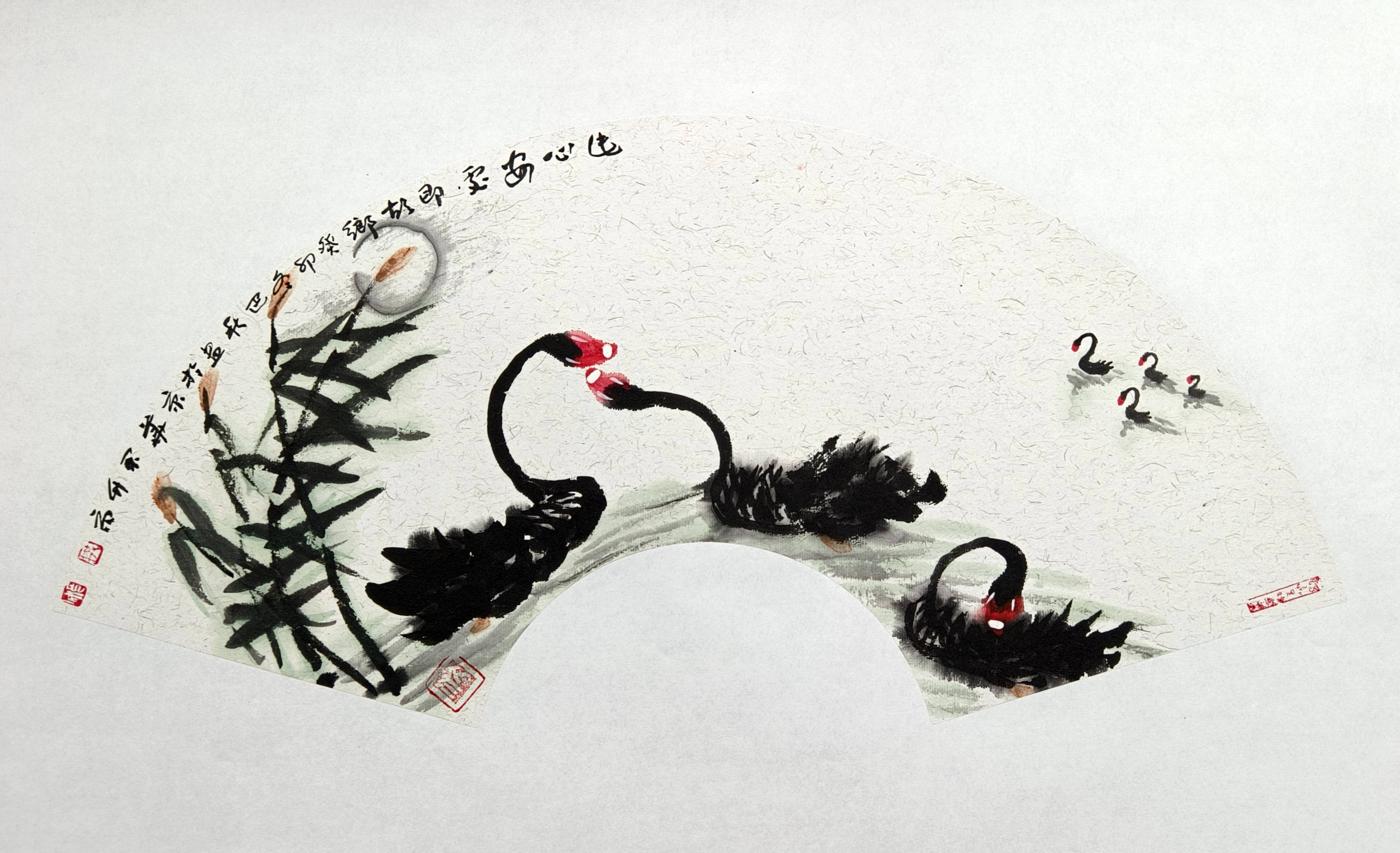 我主要是画山水的,兼画果蔬。画风兼工带写,画得很累。于是,我就想用笔墨画点轻松的、写意的东西。一次陪朋友去溱河湿地游览,见到河塘里游弋着的黑天鹅。一只只,一群群的,全身羽毛墨黑,红脑袋,白鼻子,生动活泼,煞是可爱。配上周围碧波荡漾,河畔绿树翠草,真是美得动人心魄。我倏地生出一个念头:我要画黑天鹅,而且要用写意的笔墨画,想必会产生意想不到的艺术效果。