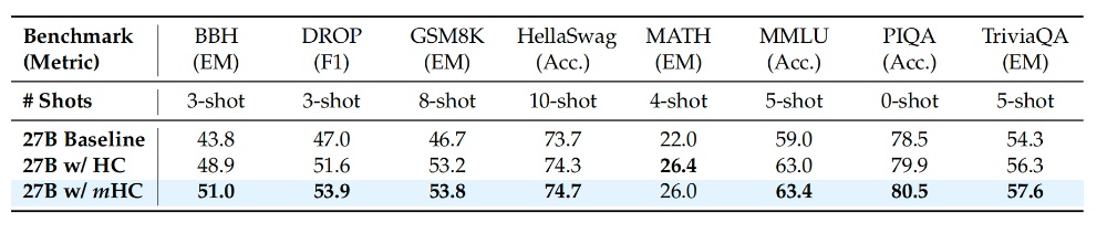 在8个下游任务上,mHC全面超越HC,尤其在BBH(+2.1%)和DROP(+2.3%)上表现突出。
