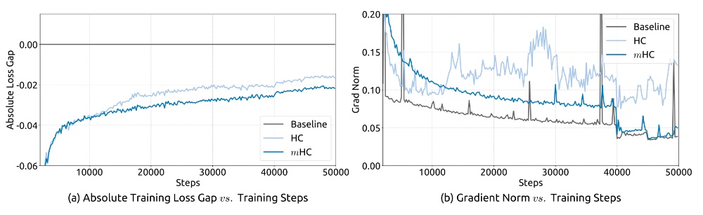 这说明,mHC通过双随机流形约束,有效抑制了多层堆叠中的信号放大与梯度爆炸问题,损失曲线平稳收敛,梯度范数保持稳定,解决了HC因数值不稳定导致的训练发散缺陷。