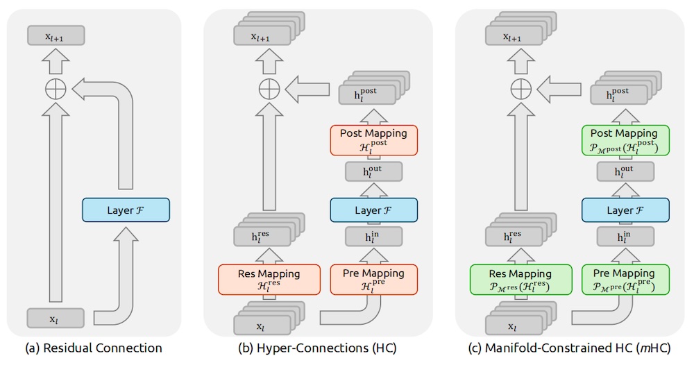 DeepSeek提出的mHC结构通过流形投影重建了残差连接的稳定性。