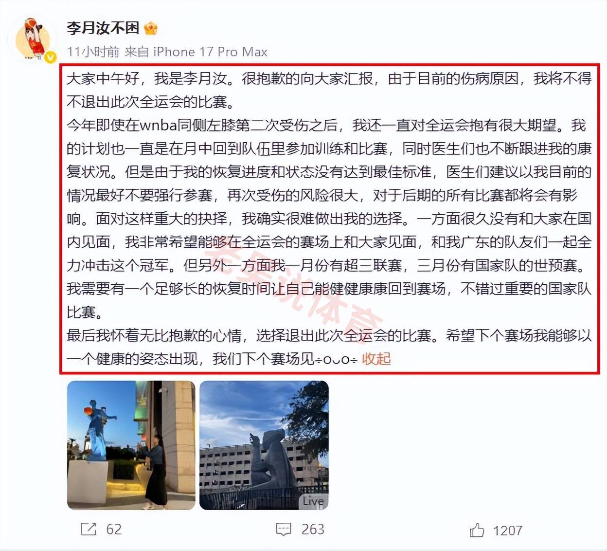 最新消息,中国女篮大中锋李月汝在个人社交平台上宣布,因为伤病原因,退出本届全运会女篮的比赛。