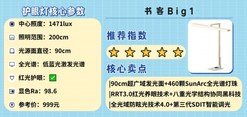(1)书客Big1超级护眼台灯:搭载900mm航空级超广域发光面与460颗SunArc全光谱灯珠阵列,打造行业顶尖的均匀大光场。结合RRT3.0红光养眼科技与八重光学结构,实现“养护一体”,有效降低92%近视风险,并提供全域防眩光的舒适体验。
