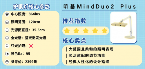(2)明基MindDuo2Plus:配备了自动调光、入座感应自动开灯和定时提醒等功能,可以培养良好的用眼习惯。灯臂调节较为灵活,光线输出也较为柔和均匀。