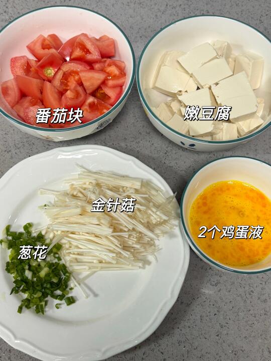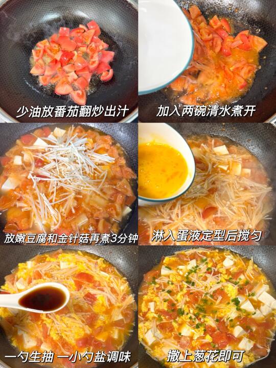 食材:番茄、嫩豆腐、金针菇、鸡蛋、葱花
