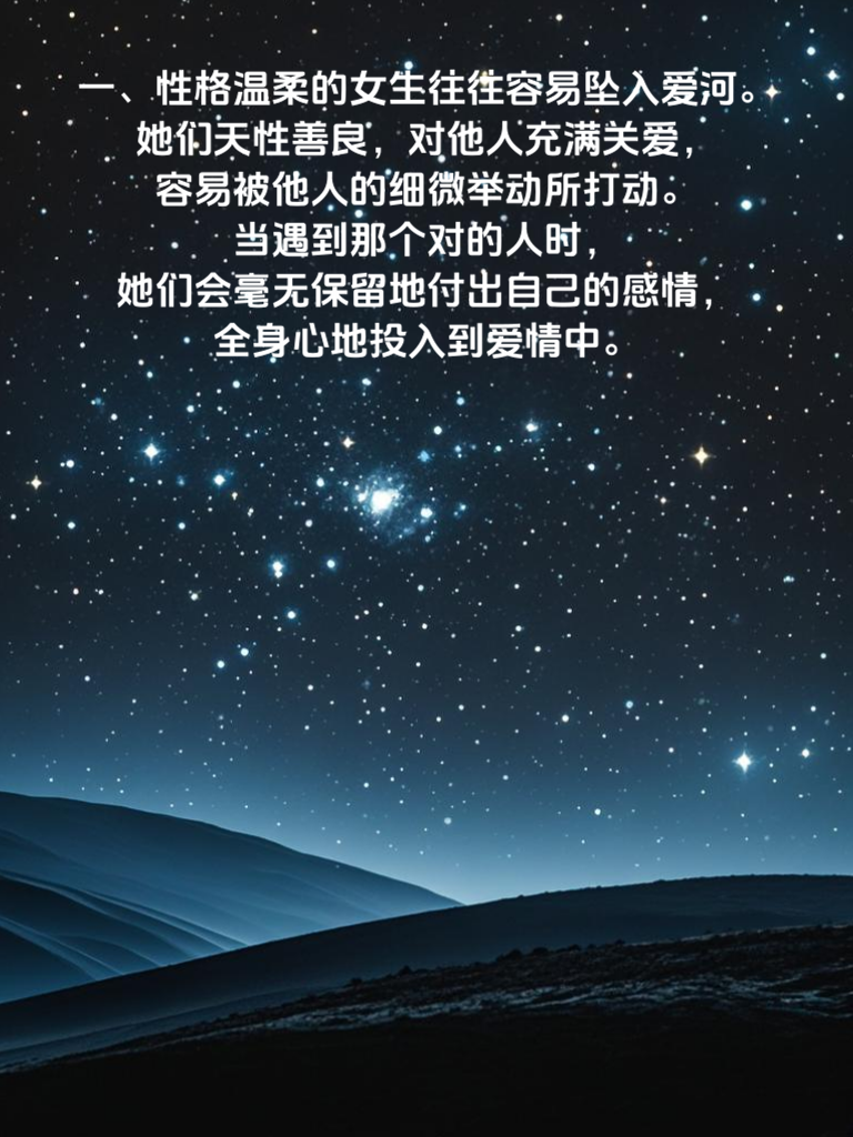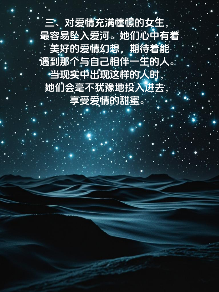 一、性格温柔的女生往往容易坠入爱河。她们天性善良,对他人充满关爱,容易被他人的细微举动所打动。当遇到那个对的人时,她们会毫无保留地付出自己的感情,全身心地投入到爱情中。 二、缺乏安全感的女生也容易坠入爱河。她们在生活中常常感到孤独和无助,渴望得到他人的陪伴和保护。一旦遇到那个能给她们安全感的人,她们就会紧紧抓住,不愿放手。 三、对爱情充满憧憬的女生,最容易坠入爱河。她们心中有着美好的爱情幻想,期待着能遇到那个与自己相伴一生的人。当现实中出现这样的人时,她们会毫不犹豫地投入进去,享受爱情的甜蜜。 四、经历过挫折的女生,往往更懂得珍惜爱情,也更容易坠入爱河。她们曾经在爱情中受过伤,更加明白爱情的珍贵,一旦遇到合适的人,就会格外珍惜,用心去经营这段感情。