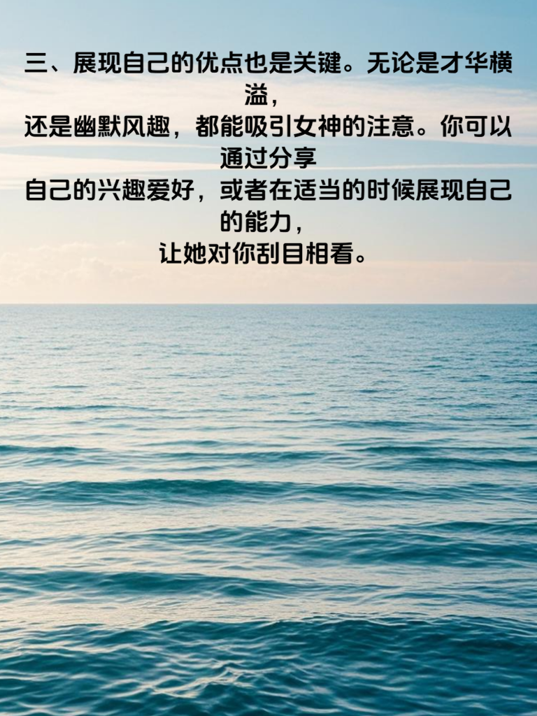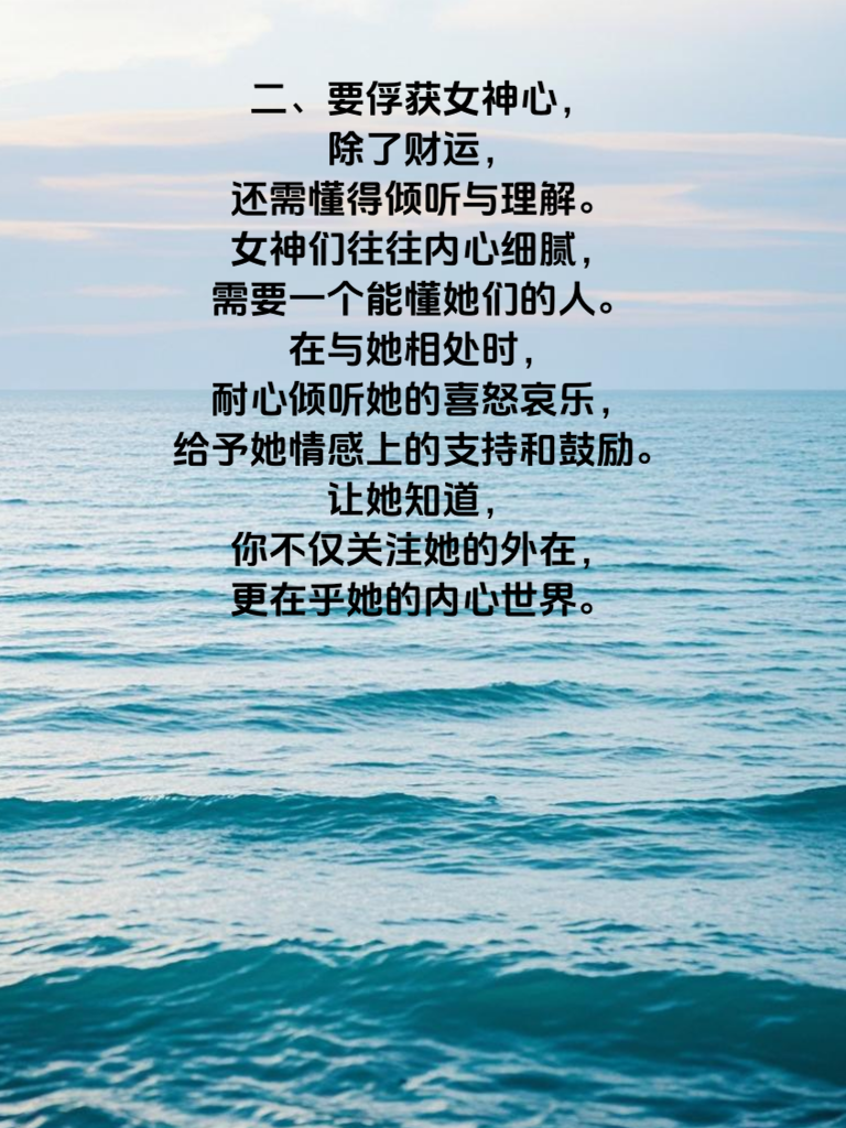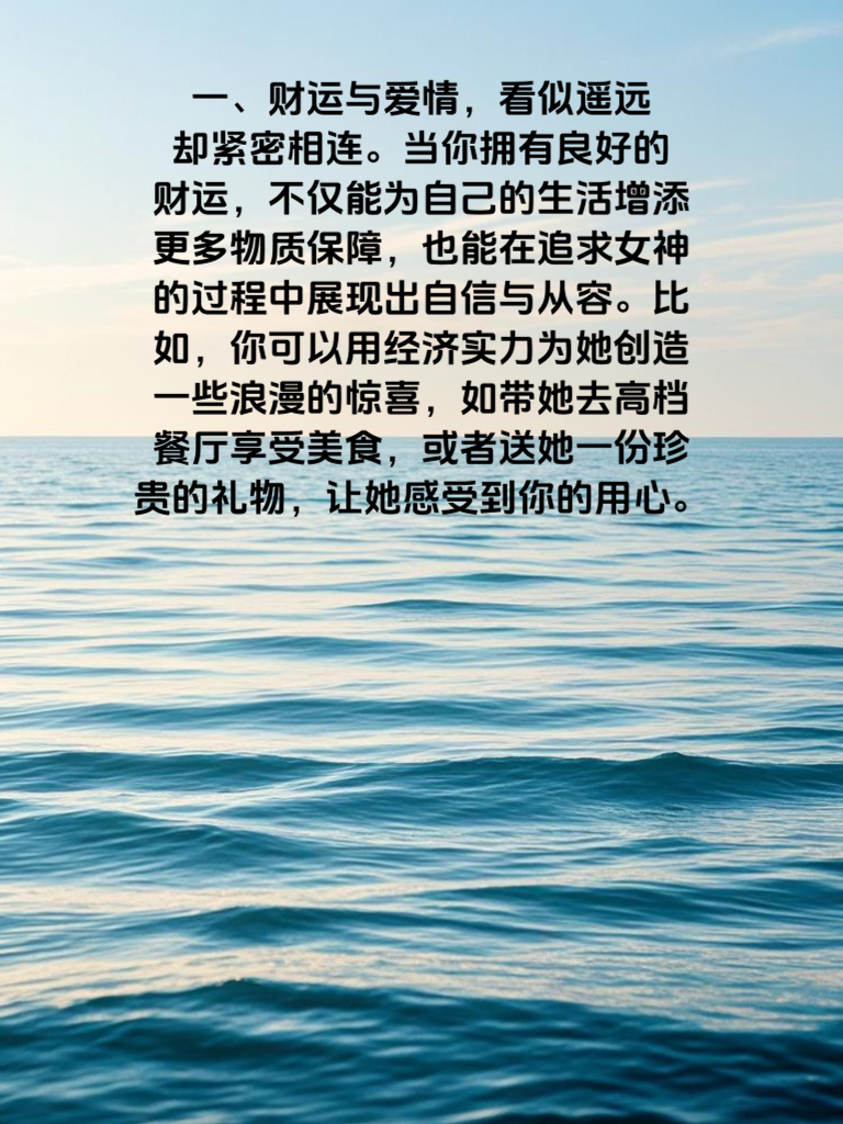 一、财运与爱情,看似遥远却紧密相连。当你拥有良好的财运,不仅能为自己的生活增添更多物质保障,也能在追求女神的过程中展现出自信与从容。比如,你可以用经济实力为她创造一些浪漫的惊喜,如带她去高档餐厅享受美食,或者送她一份珍贵的礼物,让她感受到你的用心。 二、要俘获女神心,除了财运,还需懂得倾听与理解。女神们往往内心细腻,需要一个能懂她们的人。在与她相处时,耐心倾听她的喜怒哀乐,给予她情感上的支持和鼓励。让她知道,你不仅关注她的外在,更在乎她的内心世界。 三、展现自己的优点也是关键。无论是才华横溢还是幽默风趣,都能吸引女神的注意。你可以通过分享自己的兴趣爱好,或者在适当的时候展现自己的能力,让她对你刮目相看。 四、保持真诚与耐心。追求女神不是一蹴而就的事情,需要时间和耐心。在这个过程中,始终保持真诚,不要刻意伪装自己。相信只要你真心对待,总有一天能打动女神的芳心。