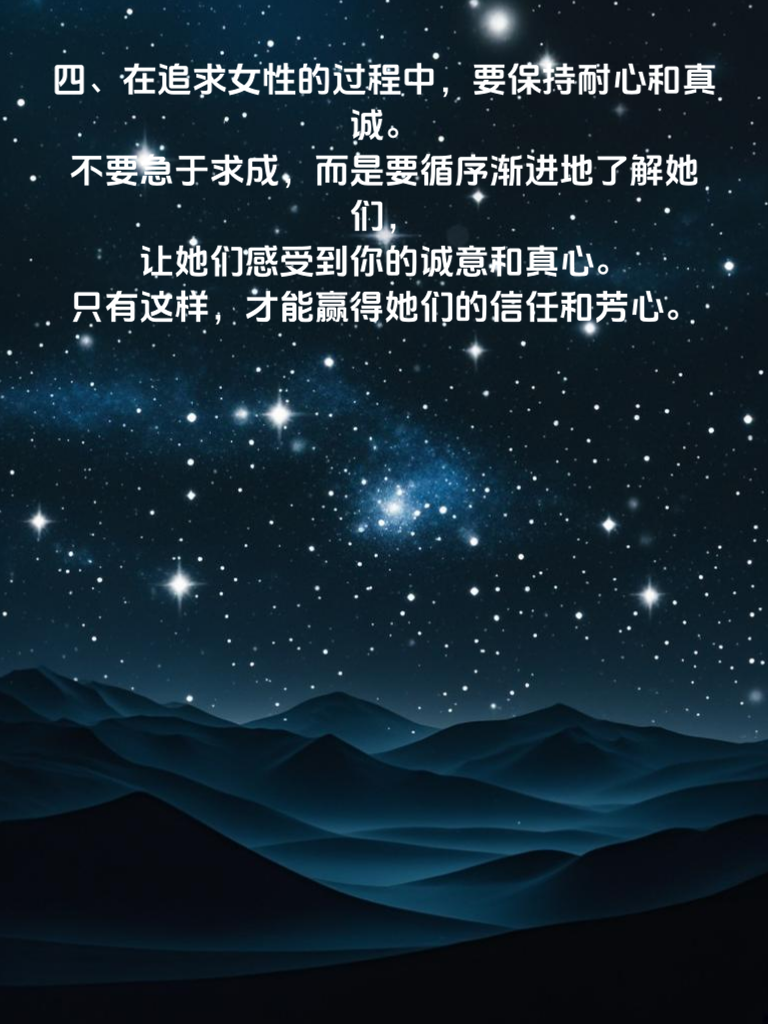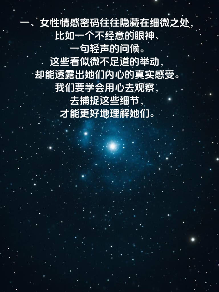 一、女性情感密码往往隐藏在细微之处,比如一个不经意的眼神、一句轻声的问候。这些看似微不足道的举动,却能透露出她们内心的真实感受。我们要学会用心去观察,去捕捉这些细节,才能更好地理解她们。 二、女性通常比较注重情感的交流与共鸣。在与她们相处时,要善于倾听她们的故事和烦恼,给予她们足够的关心和支持。让她们感受到自己被理解和重视,这样才能拉近彼此的距离。 三、送礼物也是表达情感的一种方式,但要注意礼物的选择要符合她们的喜好和个性。不要盲目跟风,而是要用心去挑选,让礼物成为你们之间情感的纽带。 四、在追求女性的过程中,要保持耐心和真诚。不要急于求成,而是要循序渐进地了解她们,让她们感受到你的诚意和真心。只有这样,才能赢得她们的信任和芳心。