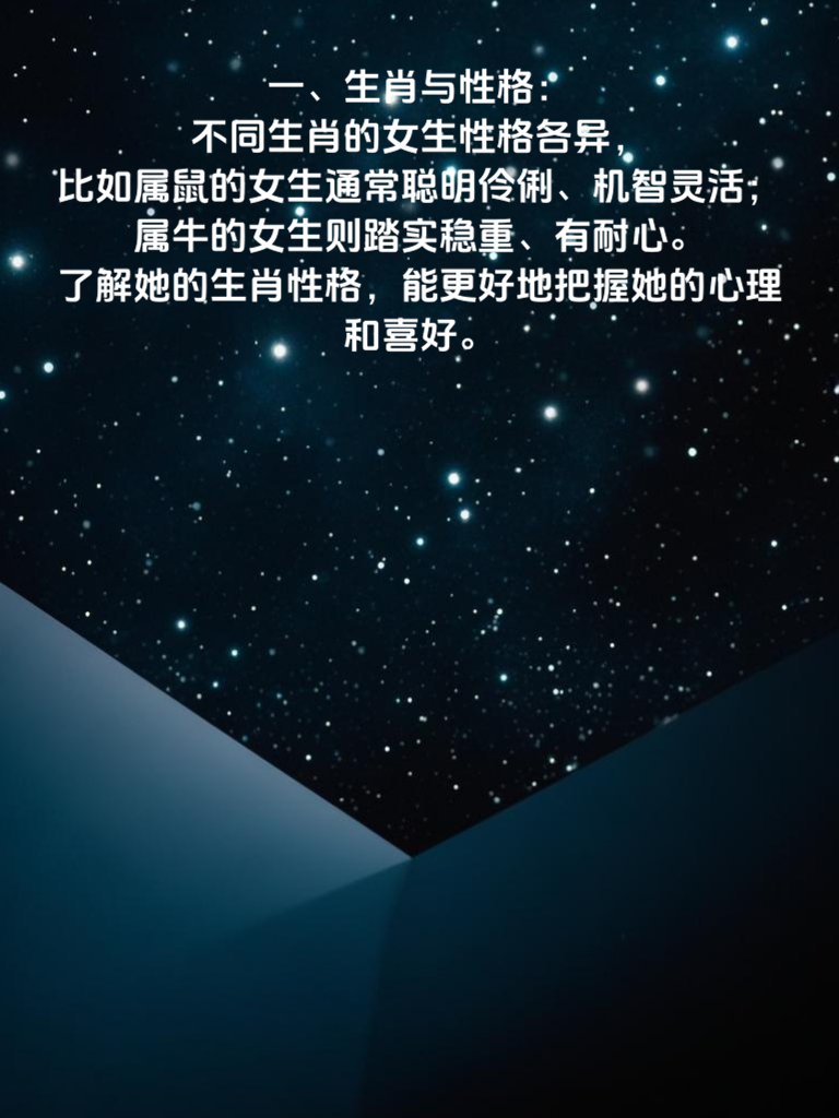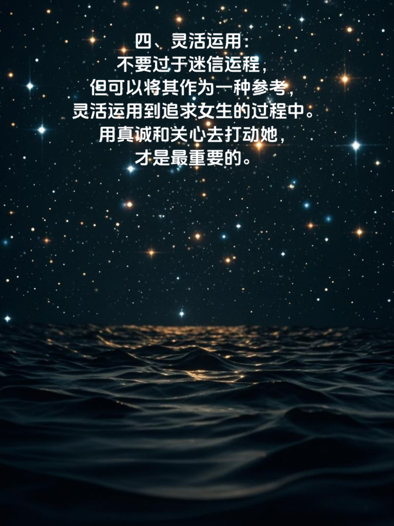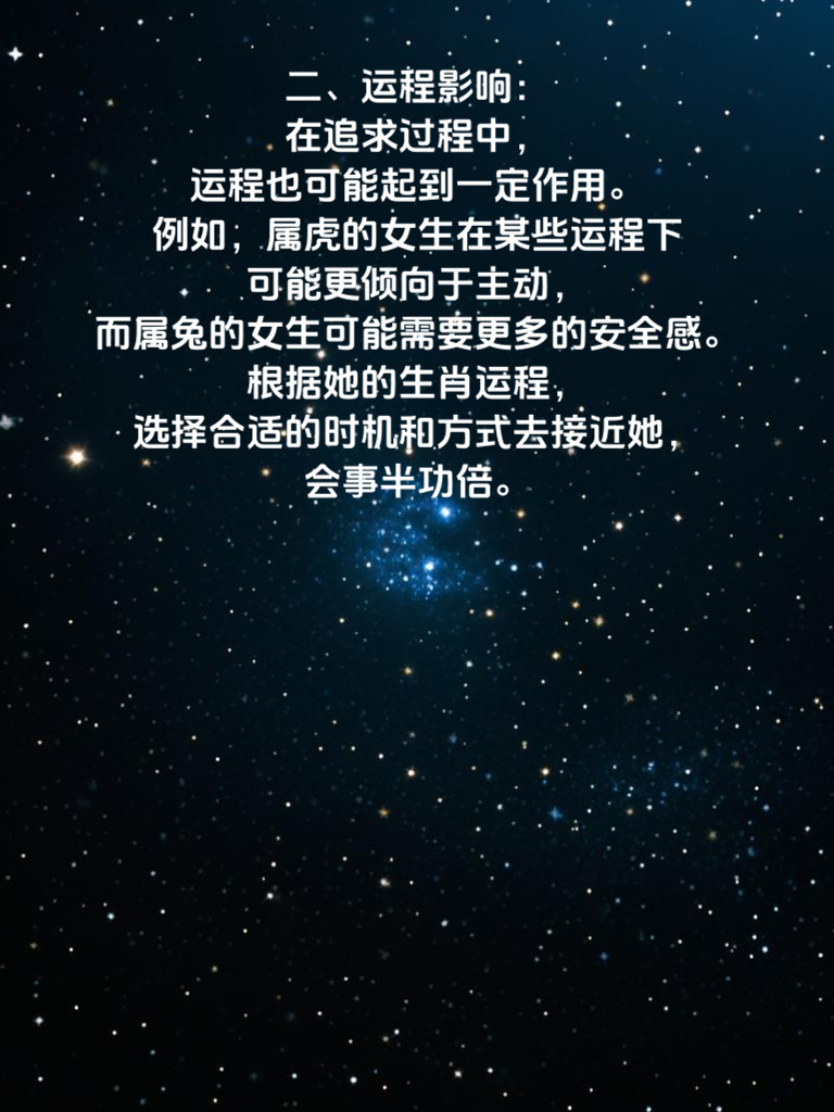 一、生肖与性格:不同生肖的女生性格各异,比如属鼠的女生通常聪明伶俐、机智灵活;属牛的女生则踏实稳重、有耐心。了解她的生肖性格,能更好地把握她的心理和喜好。 二、运程影响:在追求过程中,运程也可能起到一定作用。例如,属虎的女生在某些运程下可能更倾向于主动,而属兔的女生可能需要更多的安全感。根据她的生肖运程,选择合适的时机和方式去接近她,会事半功倍。 三、契合与互补:每个生肖都有其特点,有些生肖之间相互契合,有些则互补。了解她的生肖,找到与她相契合或互补的方面,能让你们的关系更加和谐。 四、灵活运用:不要过于迷信运程,但可以将其作为一种参考,灵活运用到追求女生的过程中。用真诚和关心去打动她,才是最重要的。