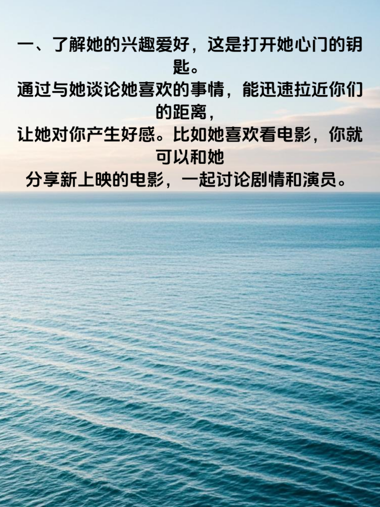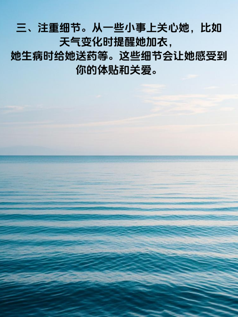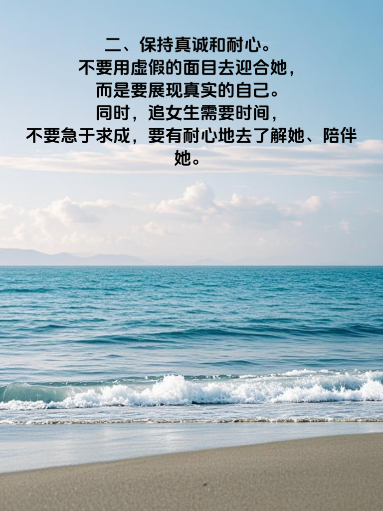 一、了解她的兴趣爱好,这是打开她心门的钥匙。通过与她谈论她喜欢的事情,能迅速拉近你们的距离,让她对你产生好感。比如她喜欢看电影,你就可以和她分享新上映的电影,一起讨论剧情和演员。 二、保持真诚和耐心。不要用虚假的面目去迎合她,而是要展现真实的自己。同时,追女生需要时间,不要急于求成,要有耐心地去了解她、陪伴她。 三、注重细节。从一些小事上关心她,比如天气变化时提醒她加衣,她生病时给她送药等。这些细节会让她感受到你的体贴和关爱。 四、提升自己的魅力。不仅要在外表上注重形象,还要提升内在的修养和素质。学习新知识,培养新爱好,让自己变得更加优秀,这样才能吸引她的注意。 五、制造浪漫的氛围。可以带她去看星空,或者为她准备一份小惊喜。浪漫的氛围能让她感受到你的爱意,增加你们之间的感情。