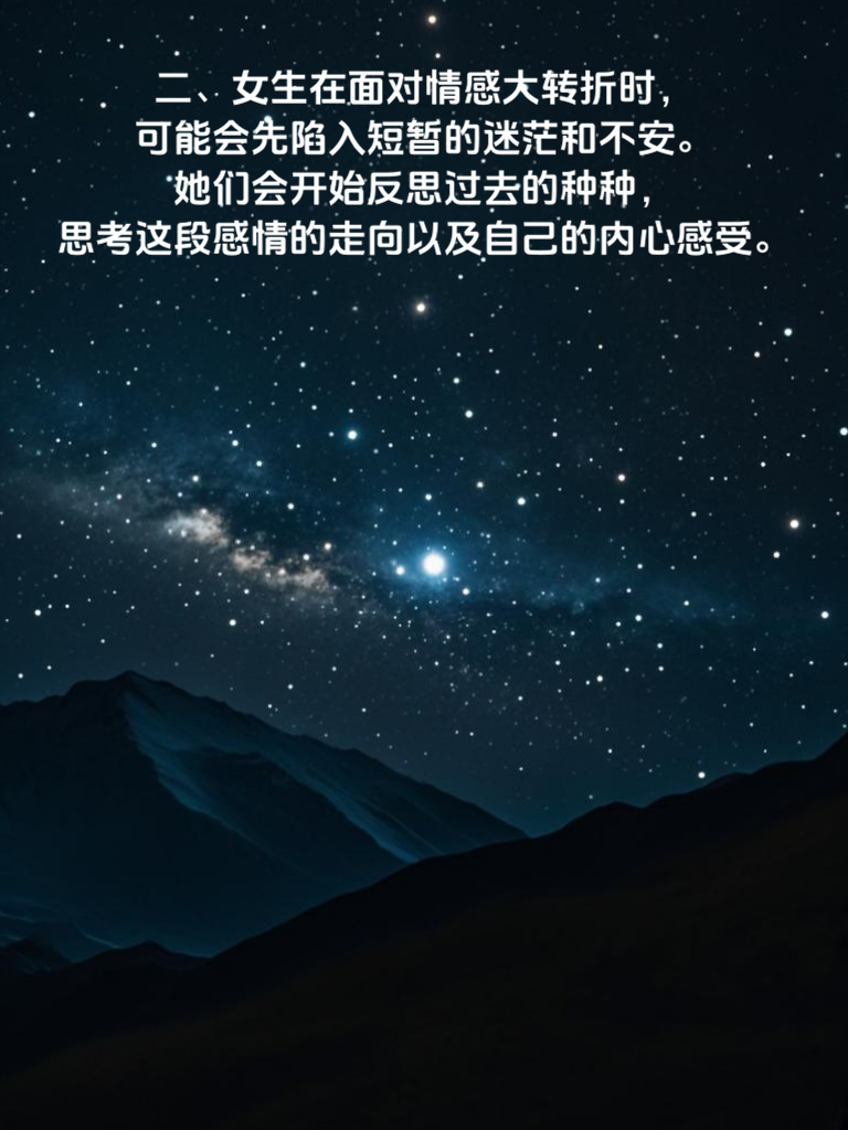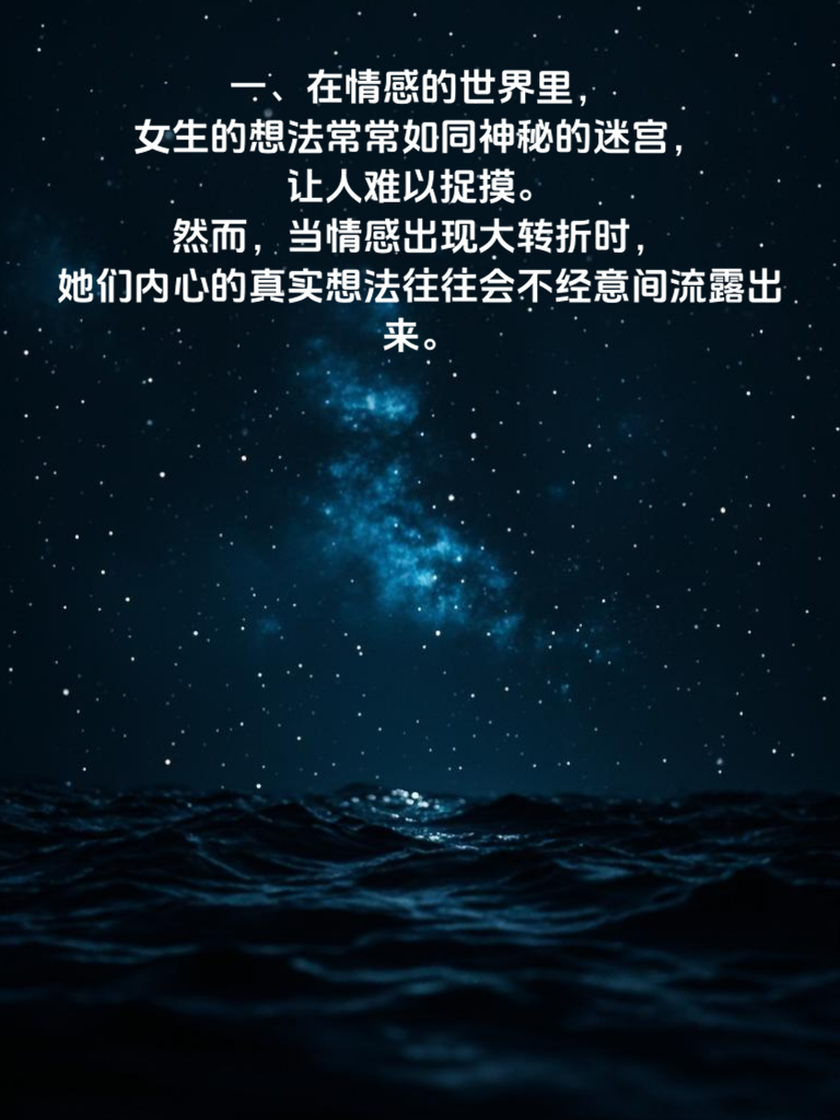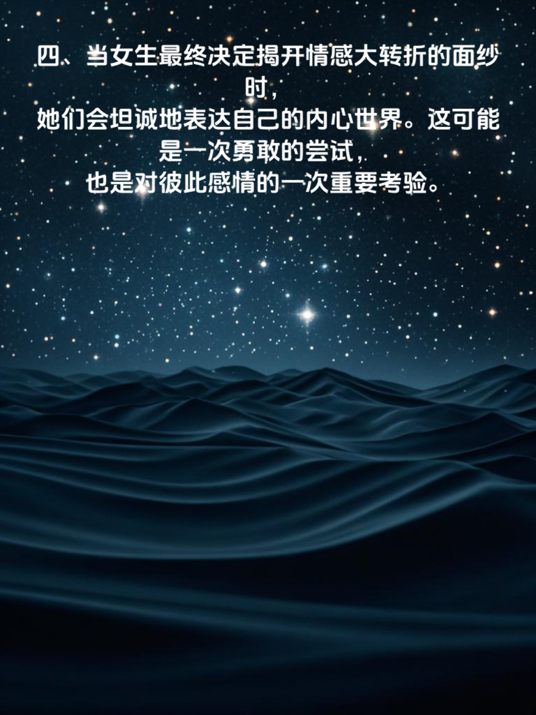 一、在情感的世界里,女生的想法常常如同神秘的迷宫,让人难以捉摸。然而,当情感出现大转折时,她们内心的真实想法往往会不经意间流露出来。 二、女生在面对情感大转折时,可能会先陷入短暂的迷茫和不安。她们会开始反思过去的种种,思考这段感情的走向以及自己的内心感受。 三、随着时间的推移,女生的真实想法逐渐清晰。她们会更加明确自己对对方的感情,是继续坚守还是选择放手。 四、当女生最终决定揭开情感大转折的面纱时,她们会坦诚地表达自己的内心世界。这可能是一次勇敢的尝试,也是对彼此感情的一次重要考验。