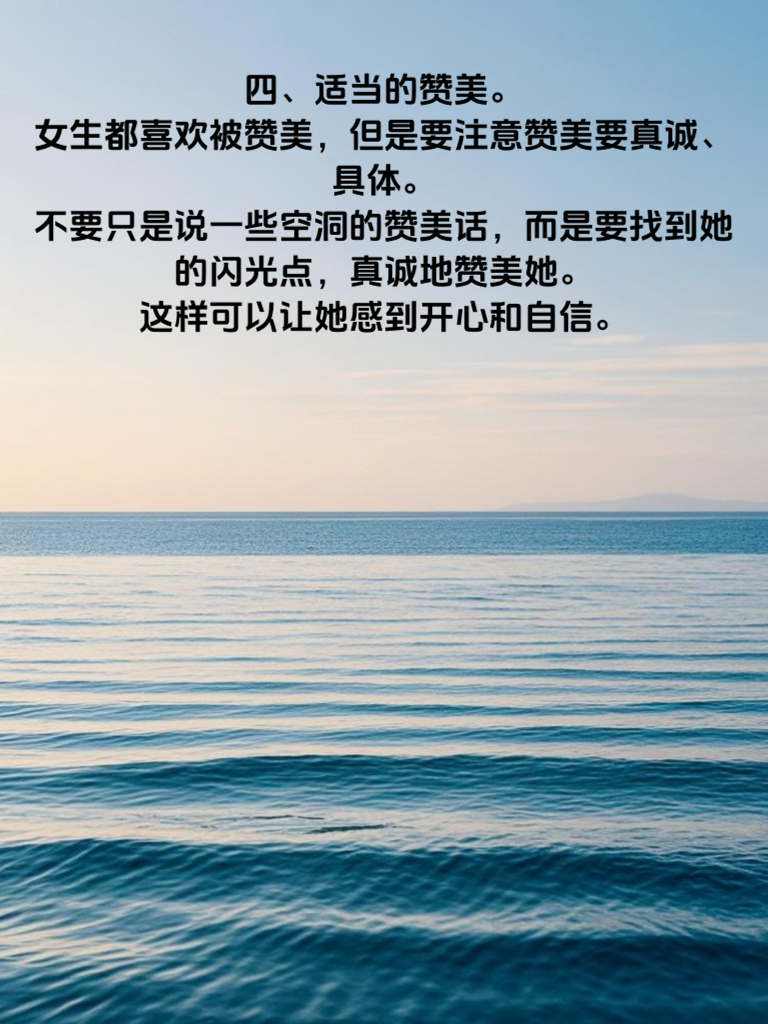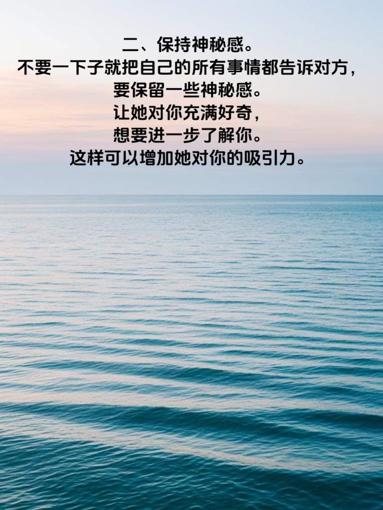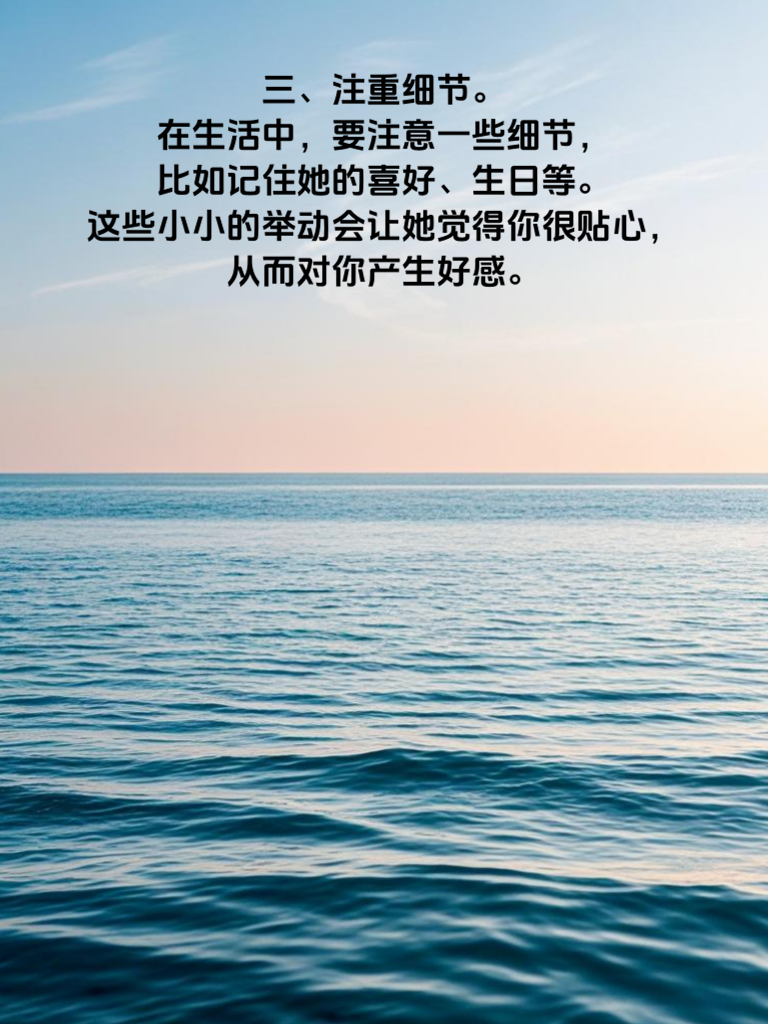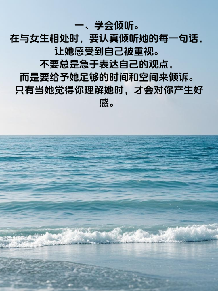 一、学会倾听。在与女生相处时,要认真倾听她的每一句话,让她感受到自己被重视。不要总是急于表达自己的观点,而是要给予她足够的时间和空间来倾诉。只有当她觉得你理解她时,才会对你产生好感。 二、保持神秘感。不要一下子就把自己的所有事情都告诉对方,要保留一些神秘感。让她对你充满好奇,想要进一步了解你。这样可以增加她对你的吸引力。 三、注重细节。在生活中,要注意一些细节,比如记住她的喜好、生日等。这些小小的举动会让她觉得你很贴心,从而对你产生好感。 四、适当的赞美。女生都喜欢被赞美,但是要注意赞美要真诚、具体。不要只是说一些空洞的赞美话,而是要找到她的闪光点,真诚地赞美她。这样可以让她感到开心和自信。