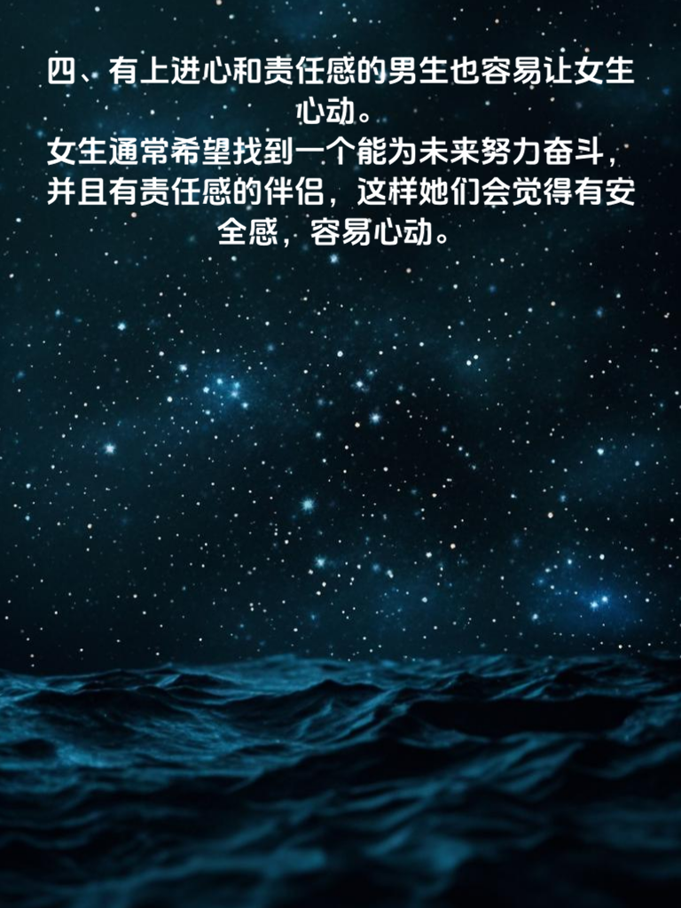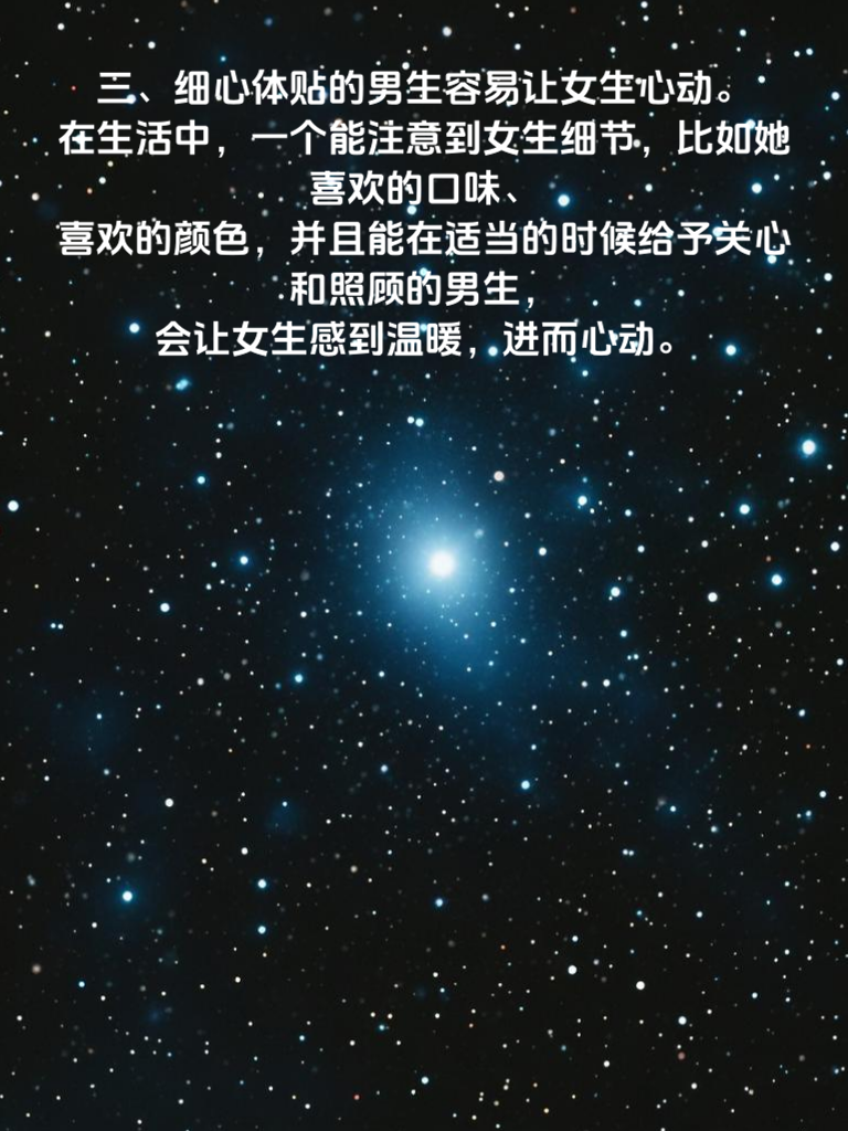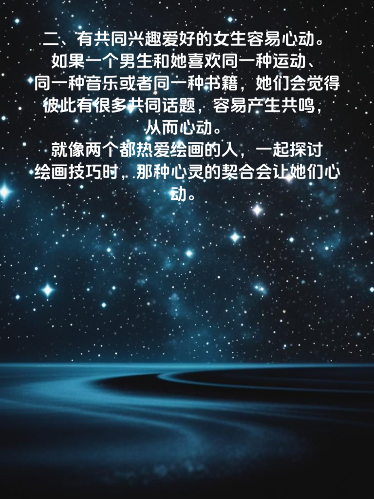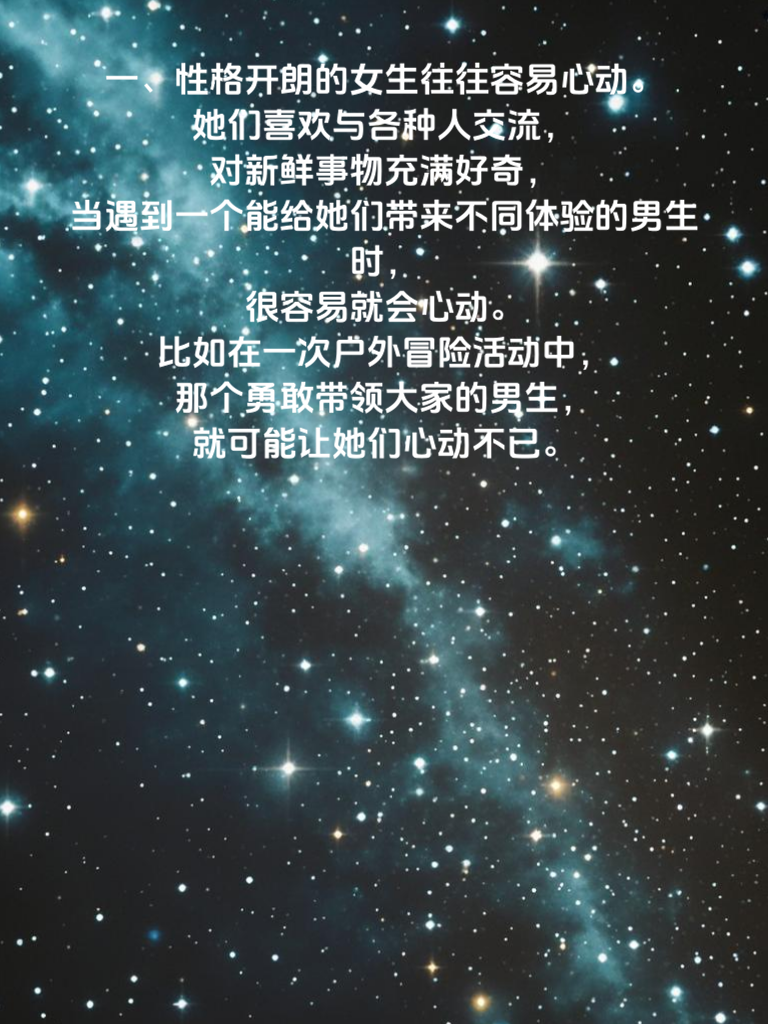 一、性格开朗的女生往往容易心动。她们喜欢与各种人交流,对新鲜事物充满好奇,当遇到一个能给她们带来不同体验的男生时,很容易就会心动。比如在一次户外冒险活动中,那个勇敢带领大家的男生,就可能让她们心动不已。 二、有共同兴趣爱好的女生容易心动。如果一个男生和她喜欢同一种运动、同一种音乐或者同一种书籍,她们会觉得彼此有很多共同话题,容易产生共鸣,从而心动。就像两个都热爱绘画的人,一起探讨绘画技巧时,那种心灵的契合会让她们心动。 三、细心体贴的男生容易让女生心动。在生活中,一个能注意到女生细节,比如她喜欢的口味、喜欢的颜色,并且能在适当的时候给予关心和照顾的男生,会让女生感到温暖,进而心动。 四、有上进心和责任感的男生也容易让女生心动。女生通常希望找到一个能为未来努力奋斗,并且有责任感的伴侣,这样她们会觉得有安全感,容易心动。