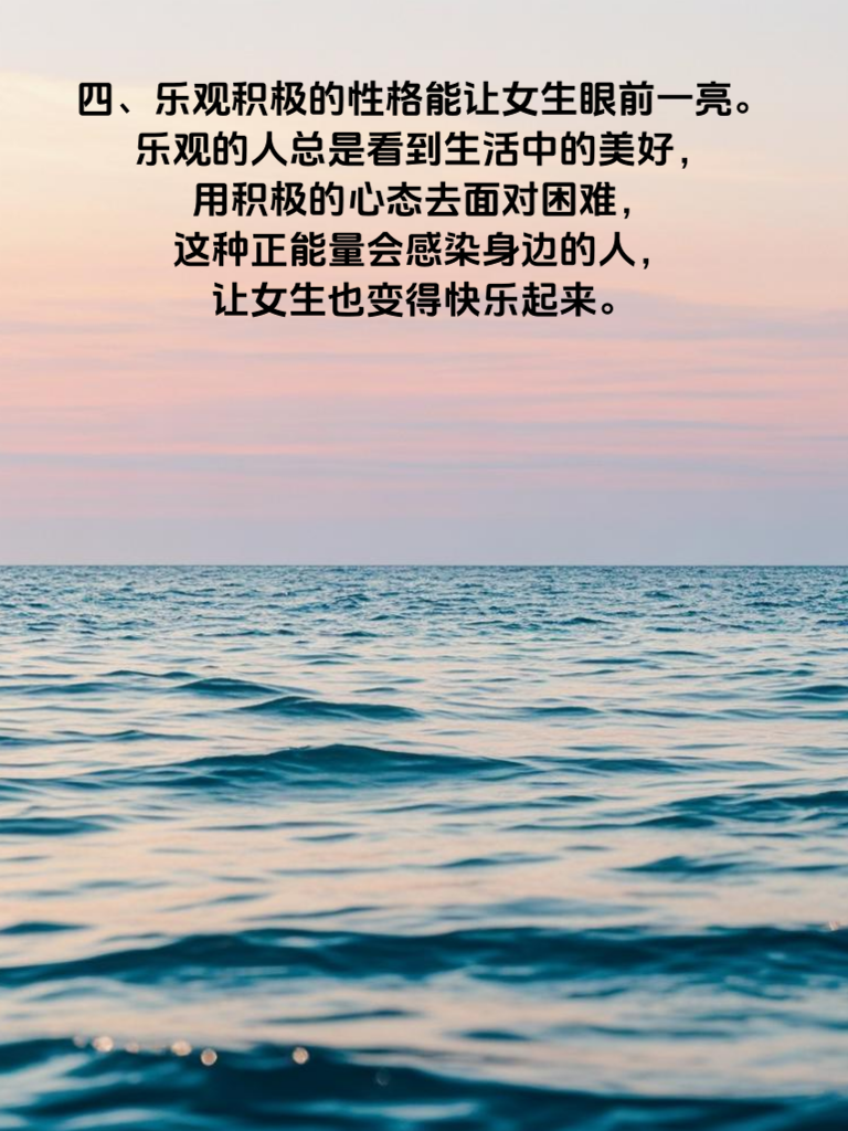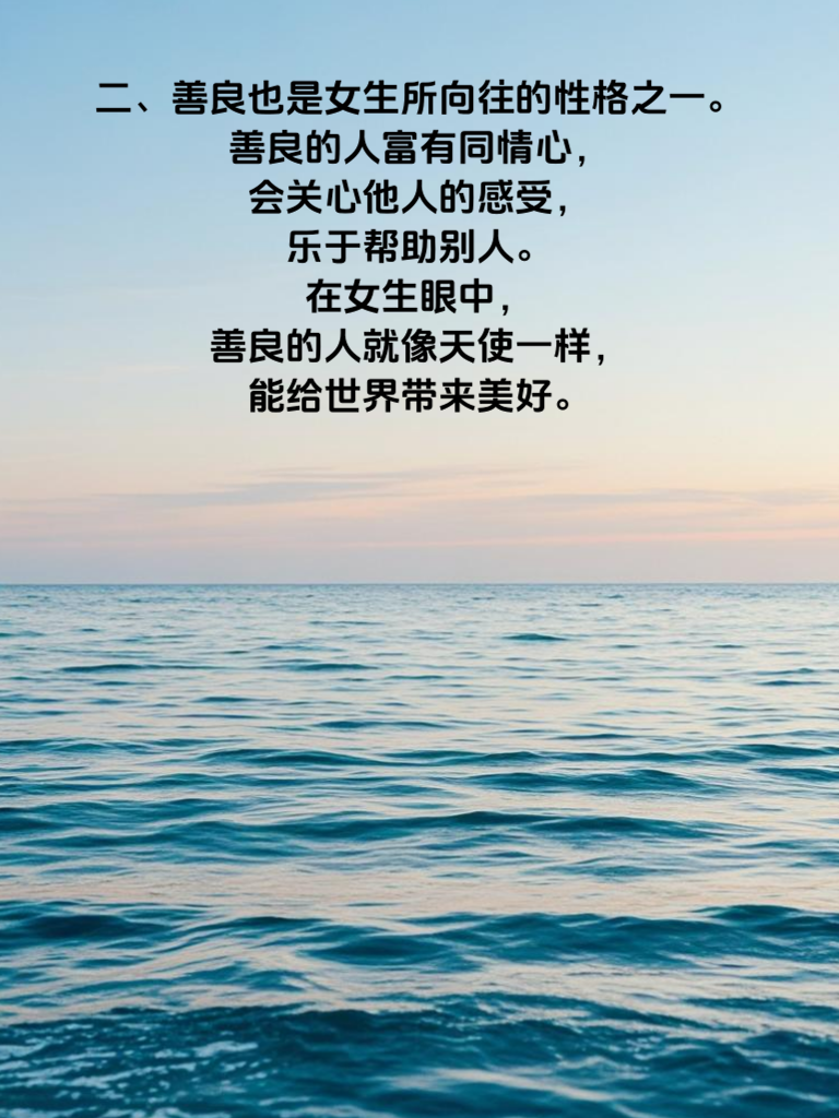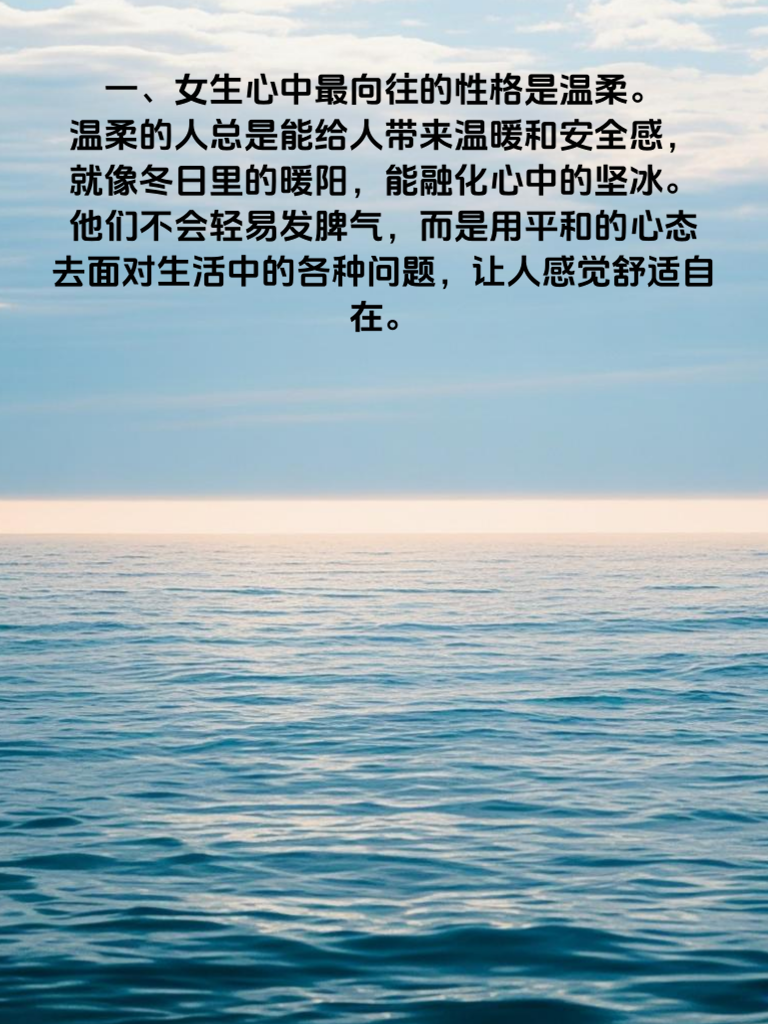 一、女生心中最向往的性格是温柔。温柔的人总是能给人带来温暖和安全感,就像冬日里的暖阳,能融化心中的坚冰。他们不会轻易发脾气,而是用平和的心态去面对生活中的各种问题,让人感觉舒适自在。 二、善良也是女生所向往的性格之一。善良的人富有同情心,会关心他人的感受,乐于帮助别人。在女生眼中,善良的人就像天使一样,能给世界带来美好。 三、有责任感的人同样深受女生喜爱。他们做事认真负责,对自己的承诺一诺千金,让女生觉得可以依靠。无论是在感情中还是生活中,有责任感的人都能给女生带来满满的安全感。 四、乐观积极的性格能让女生眼前一亮。乐观的人总是看到生活中的美好,用积极的心态去面对困难,这种正能量会感染身边的人,让女生也变得快乐起来。