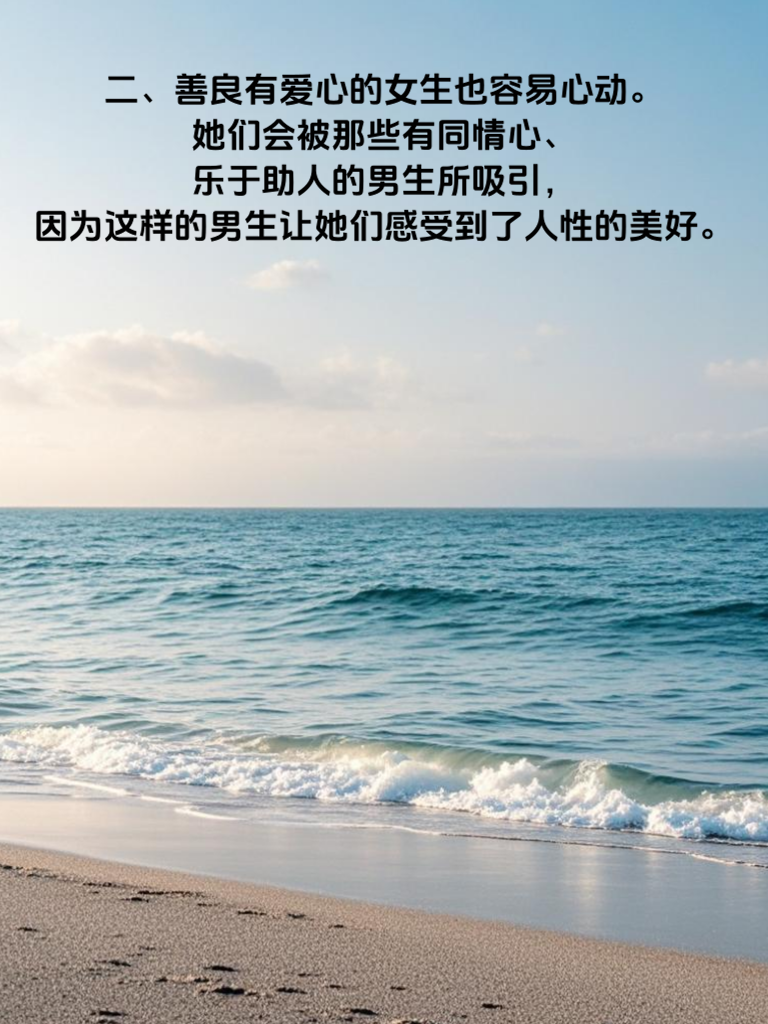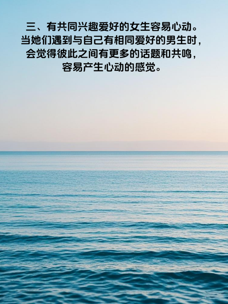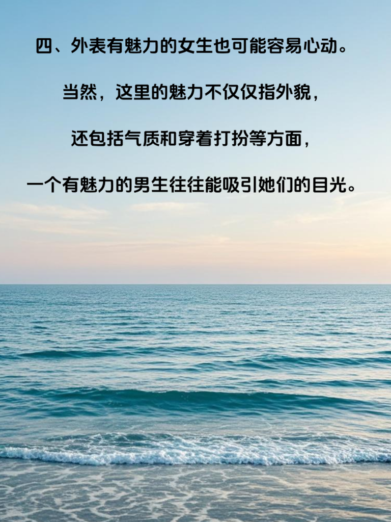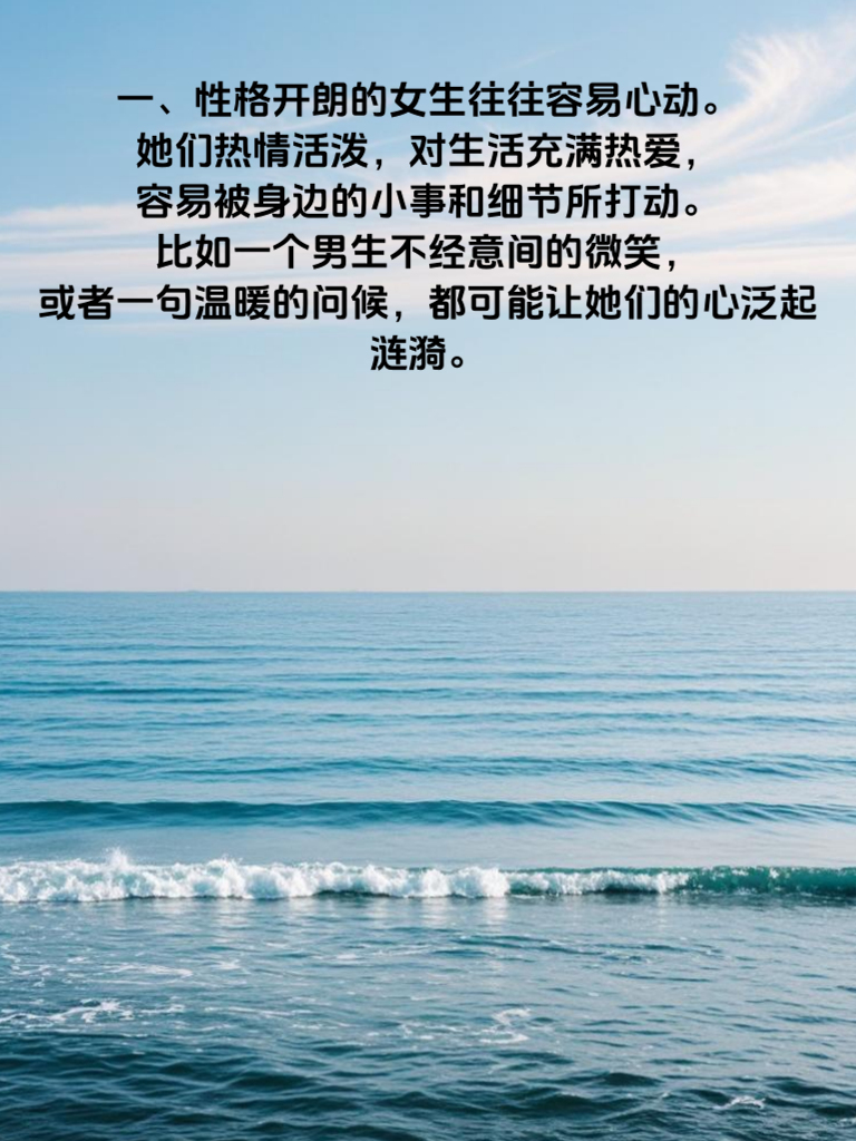 一、性格开朗的女生往往容易心动。她们热情活泼,对生活充满热爱,容易被身边的小事和细节所打动。比如一个男生不经意间的微笑,或者一句温暖的问候,都可能让她们的心泛起涟漪。 二、善良有爱心的女生也容易心动。她们会被那些有同情心、乐于助人的男生所吸引,因为这样的男生让她们感受到了人性的美好。 三、有共同兴趣爱好的女生容易心动。当她们遇到与自己有相同爱好的男生时,会觉得彼此之间有更多的话题和共鸣,容易产生心动的感觉。 四、外表有魅力的女生也可能容易心动。当然,这里的魅力不仅仅指外貌,还包括气质和穿着打扮等方面,一个有魅力的男生往往能吸引她们的目光。