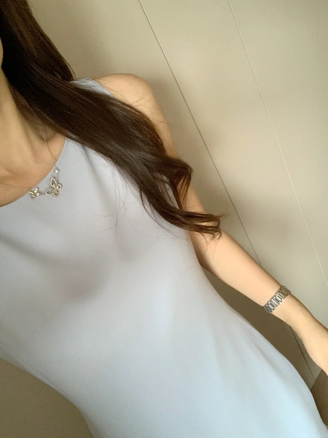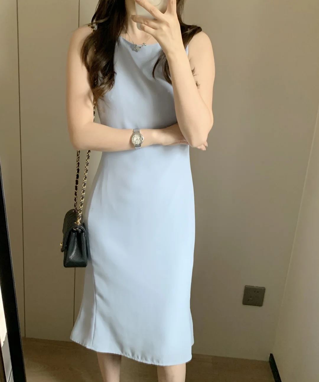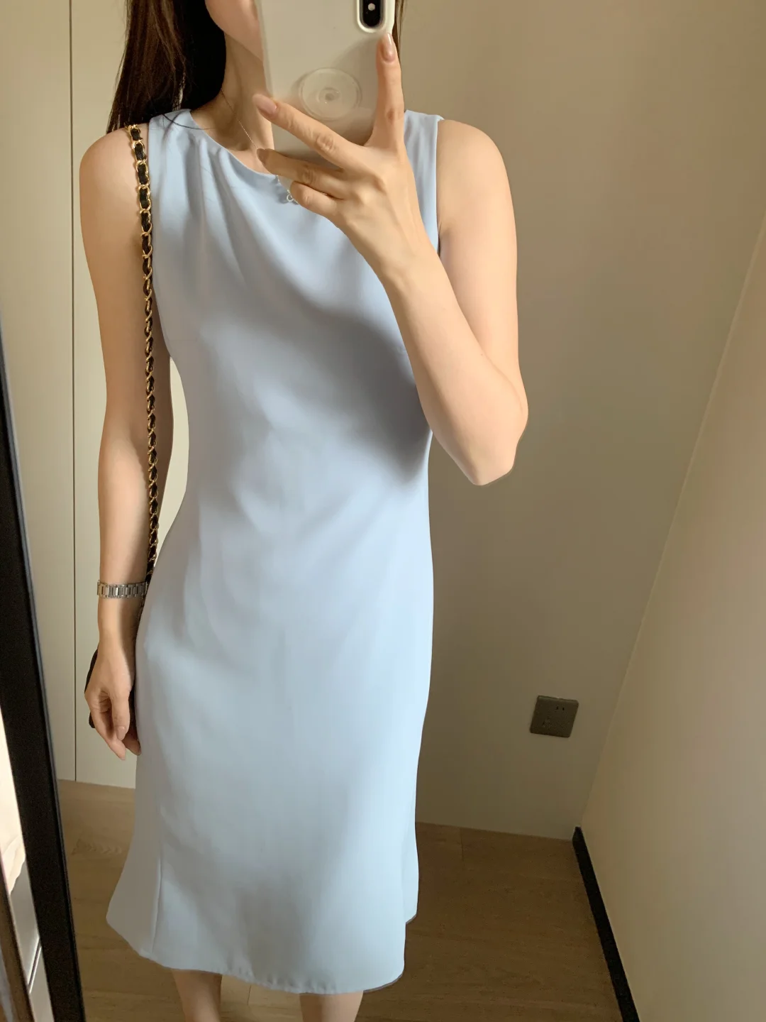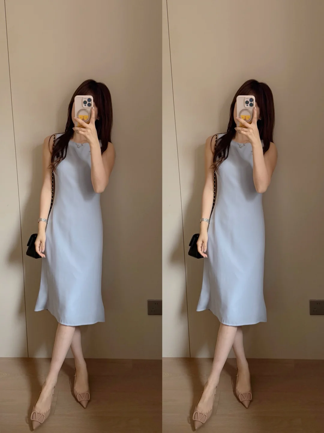 通勤穿搭灵感|无袖蓝色连衣裙,简约不简单!