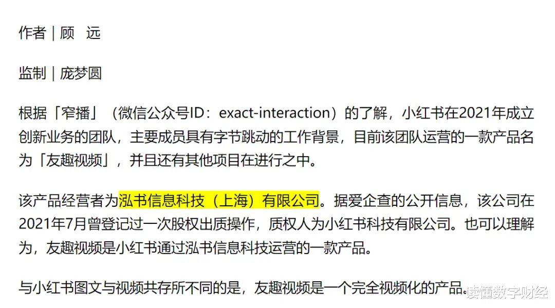再次:自媒体《窄播》2022年曾报道“小红书在2021年成立创新业务的团队,目前该团队运营的一款产品名为「友趣视频」,并且还有其他项目在进行之中”。并指出:“友趣视频运营者为泓书信息科技(上海)有限公司(下称“泓书科技”)”,而泓书信息科技(上海)有限公司正是世趣科技曾经的名字。