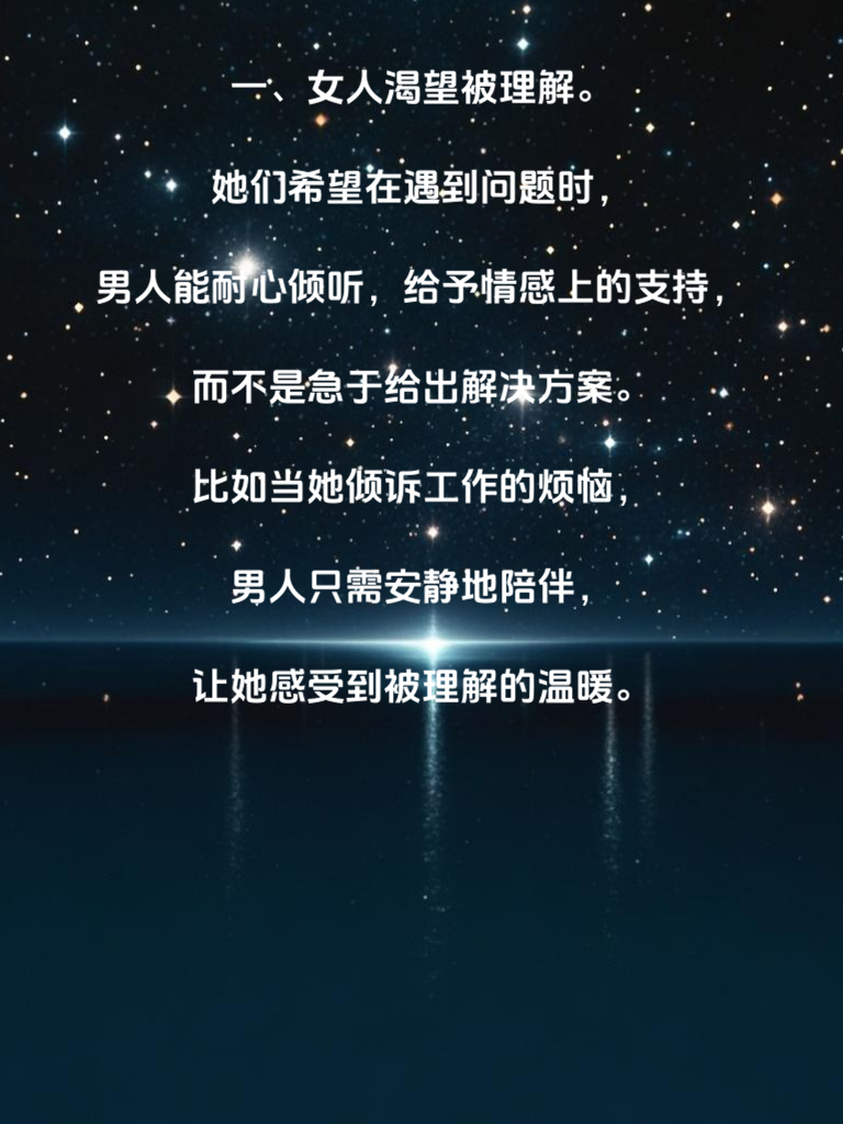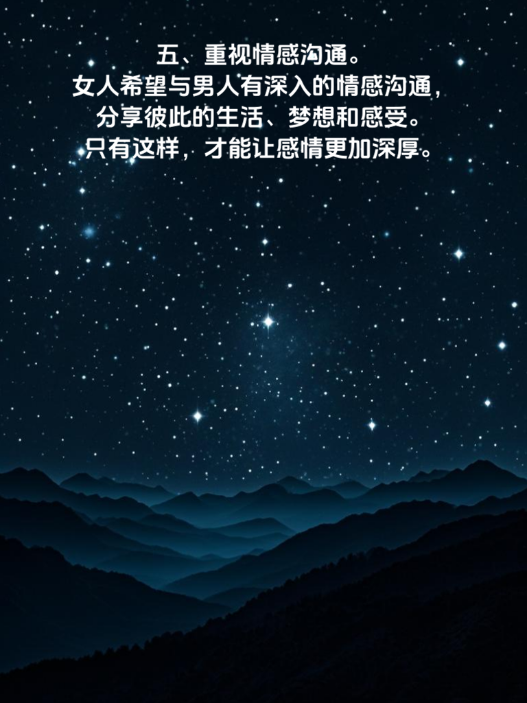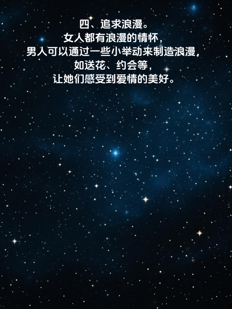 一、女人渴望被理解。她们希望在遇到问题时,男人能耐心倾听,给予情感上的支持,而不是急于给出解决方案。比如当她倾诉工作的烦恼,男人只需安静地陪伴,让她感受到被理解的温暖。 二、需要被赞美。女人喜欢听到男人对她们的赞美,无论是外貌还是内在。一句简单的‘你今天很漂亮’或‘你很聪明’,都能让她们开心一整天。 三、渴望安全感。在情感中,女人需要男人给她们足够的安全感,让她们感到安心。比如在面对困难时,男人能坚定地站在她们身边,给予力量。 四、追求浪漫。女人都有浪漫的情怀,男人可以通过一些小举动来制造浪漫,如送花、约会等,让她们感受到爱情的美好。 五、重视情感沟通。女人希望与男人有深入的情感沟通,分享彼此的生活、梦想和感受。只有这样,才能让感情更加深厚。